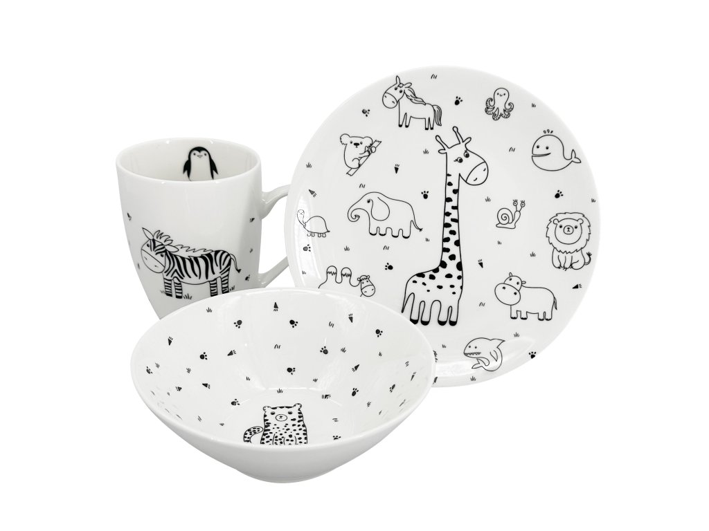 Dětský jídelní set MINI ZOO od špičkové české značky by inspire. Je vyroben z kvalitního porcelánu a je ozdoben veselými barevnými zvířátky z farmy. Krásné motivy černobílých zvířátek vaše dítě zaujme a bude se na každé jídlo těšit.