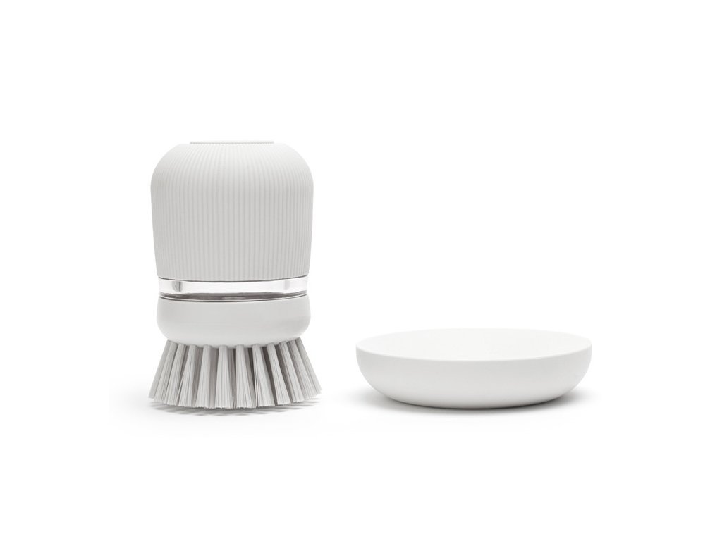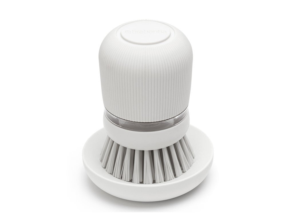 SINK SIDE Štětka se zásobníkem na jar ve světle šedé barvě z kolekce doplňků ke dřezu SINK SIDE od Brabantia. Tato chytrá pomůcka vám velmi usnadní mytí nádobí. Stisknutím tlačítka vydejte správné množství mycího prostředku. Odolné výměnné nylonové štětiny jsou dostatečně odolné pro drhnutí, ale také tak měkké, že nic nepoškrábou. Mějte kartáč vždy po ruce v úhledné misce. Snadno se drží, ergonomický kartáč s bezpečnou rukojetí, i když je mokrý.