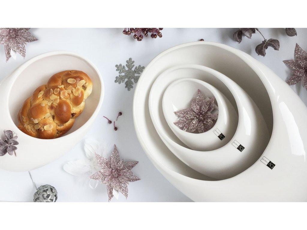 Sada 3 kusů keramickým mís Bean velikosti S, M a L v klasické a snadno kombinovatelné bílé barvě je úžasným výrazným doplňkem po celý rok. Můžete do ní naaranžovat suché i živé květiny, protože má kvalitní a lesklou pevnou glazuru, která nepropouští vodu. A pokud ji zrovna nechcete použít pro aranžování, velmi dobře ji využijete pro servírování oříšků, brambůrků a jiných pochutin.