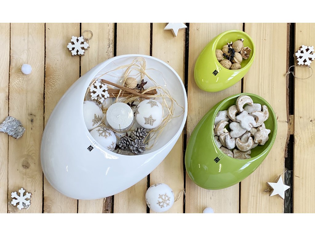Sada 3 kusů keramickým mís Bean velikosti S, M a L v klasické a snadno kombinovatelné bílé a zelené barvě je úžasným výrazným doplňkem po celý rok. Můžete do ní naaranžovat suché i živé květiny, protože má kvalitní a lesklou pevnou glazuru, která nepropouští vodu. A pokud ji zrovna nechcete použít pro aranžování, velmi dobře ji využijete pro servírování oříšků, brambůrků a jiných pochutin.