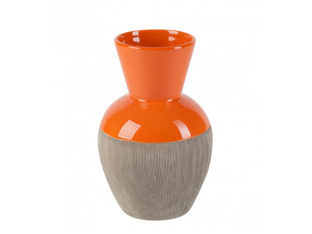 Keramická váza Rotund v kombinaci oranžové lesklé barvy a matné šedé je klasická menší váza velmi oblíbeného tvaru vhodná na jarní květiny jako jsou tulipány, narcisy nebo luční kvítí. Je vyrobena z keramiky a nepropouští vodu.