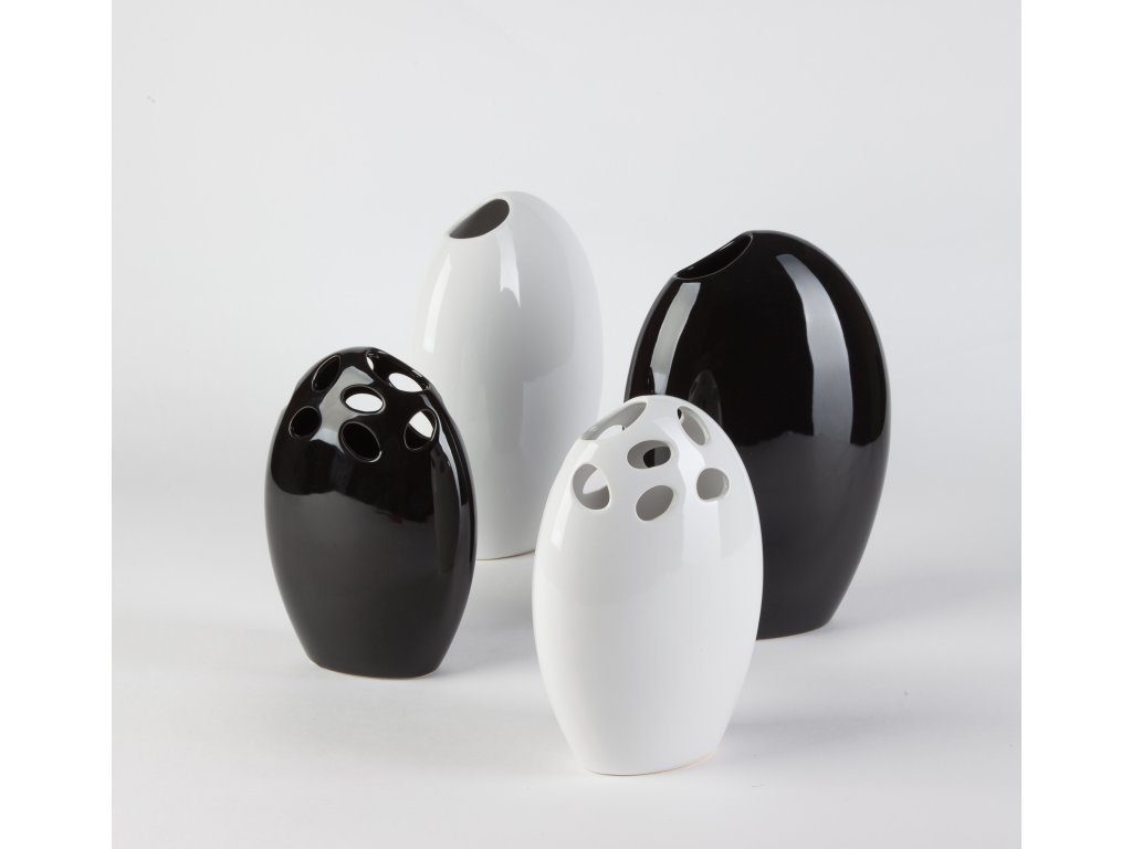 Krásná keramická váza EGG HOLE výšky 21,5 cm v klasické a nadčasové černé barvě se zajímavými průřezy a otvory oživí váš interiér svým tvarem i barvou. Váza je vhodná na aranžování suchých i živých květů nebo jako dekorace jen volně stojící.