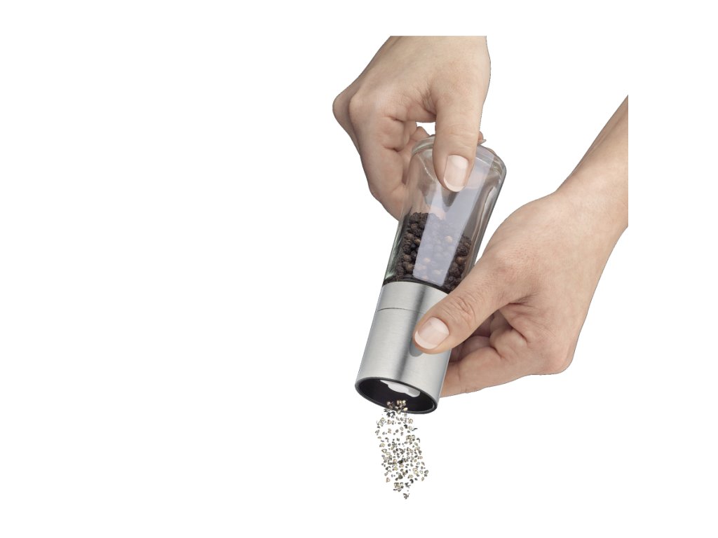BARI Mlýnek na pepř v provedení matná nerezová ocel a sklo s výškou 14 cm se hodí na každý stůl.