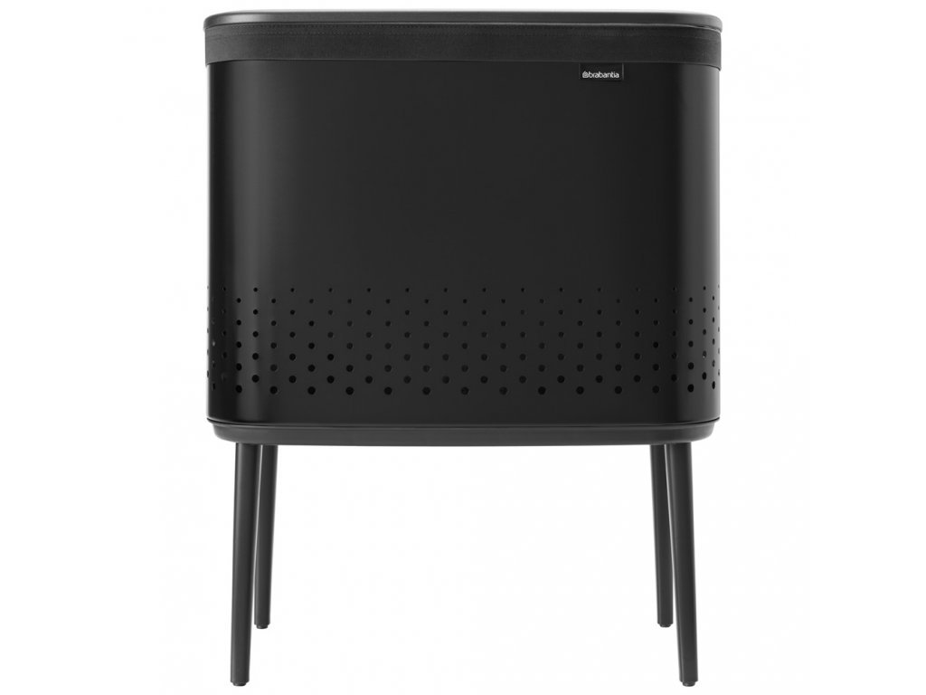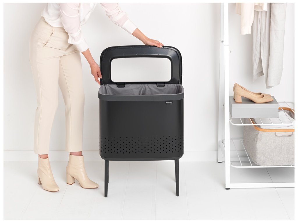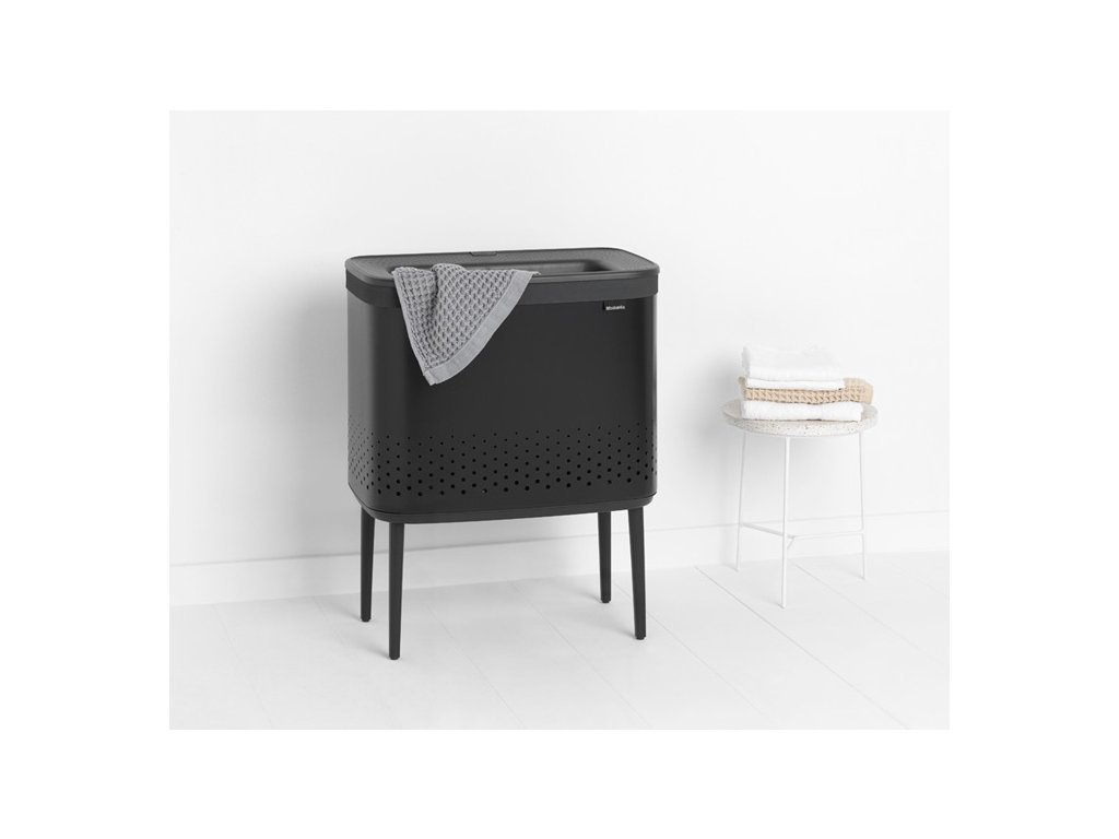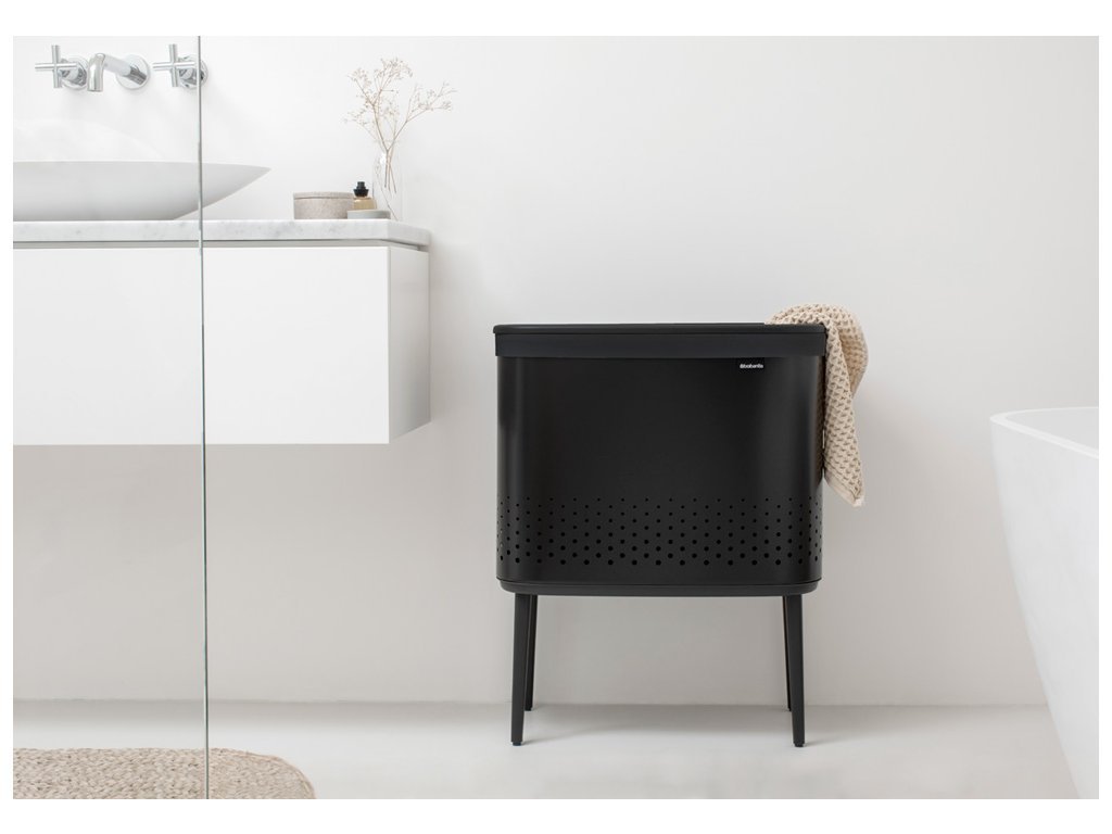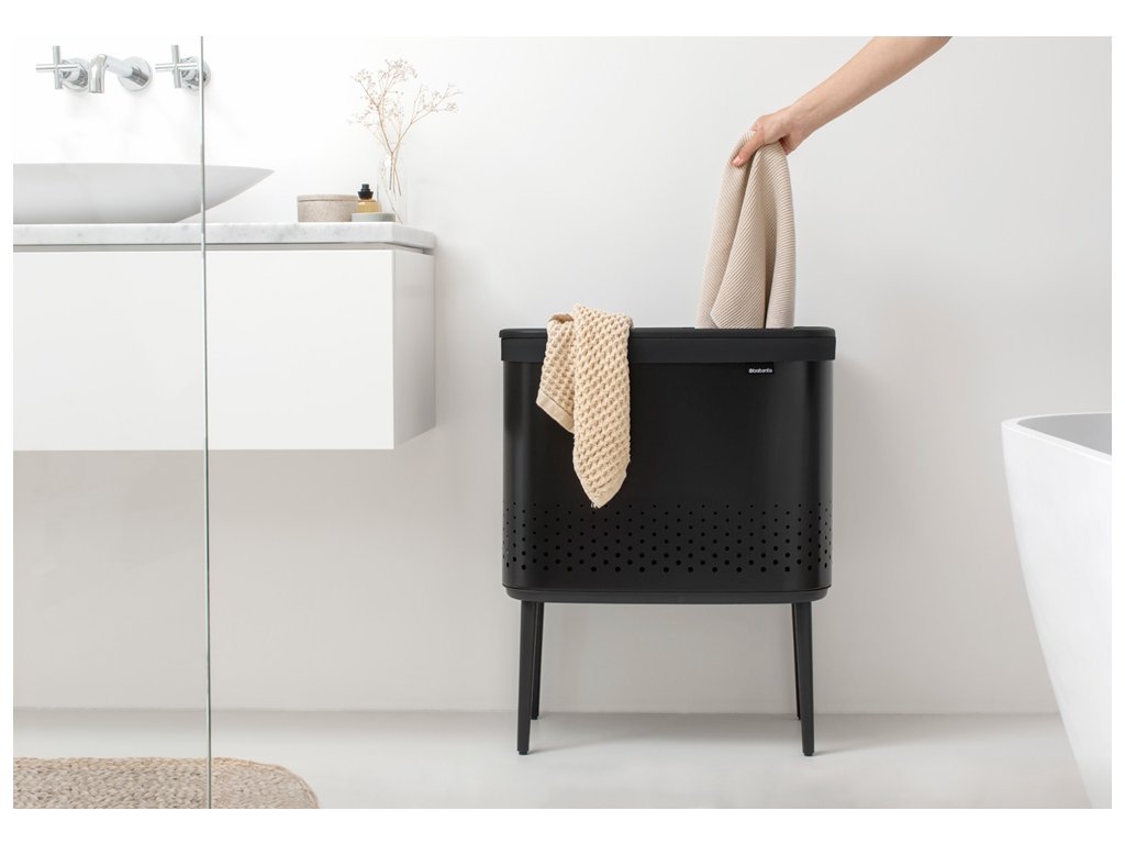Praktický prádelní koš s ideálním objemem 2x45 l v krásné matně černé barvě a černým plastovým víkem od holandské značky Brabantia.