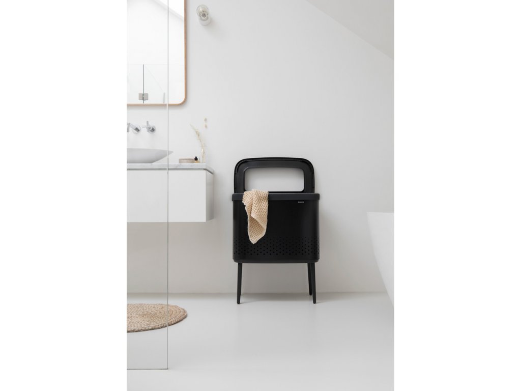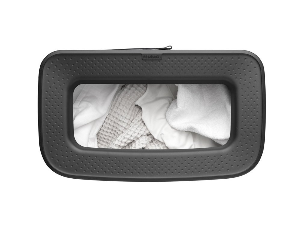 Koš na prádlo s kapacitou 60 litrů v matně černé barvě s černým plastovým víkem od výrobce Brabantia. U menších kusů prádla není nutné sundávat víko, prádlo rovnou hodíte do koše díky speciálnímu otvoru Quick-drop. Přiléhá naplocho ke zdi a díky nastavitelným protiskluzovým nohám je velmi stabilní.