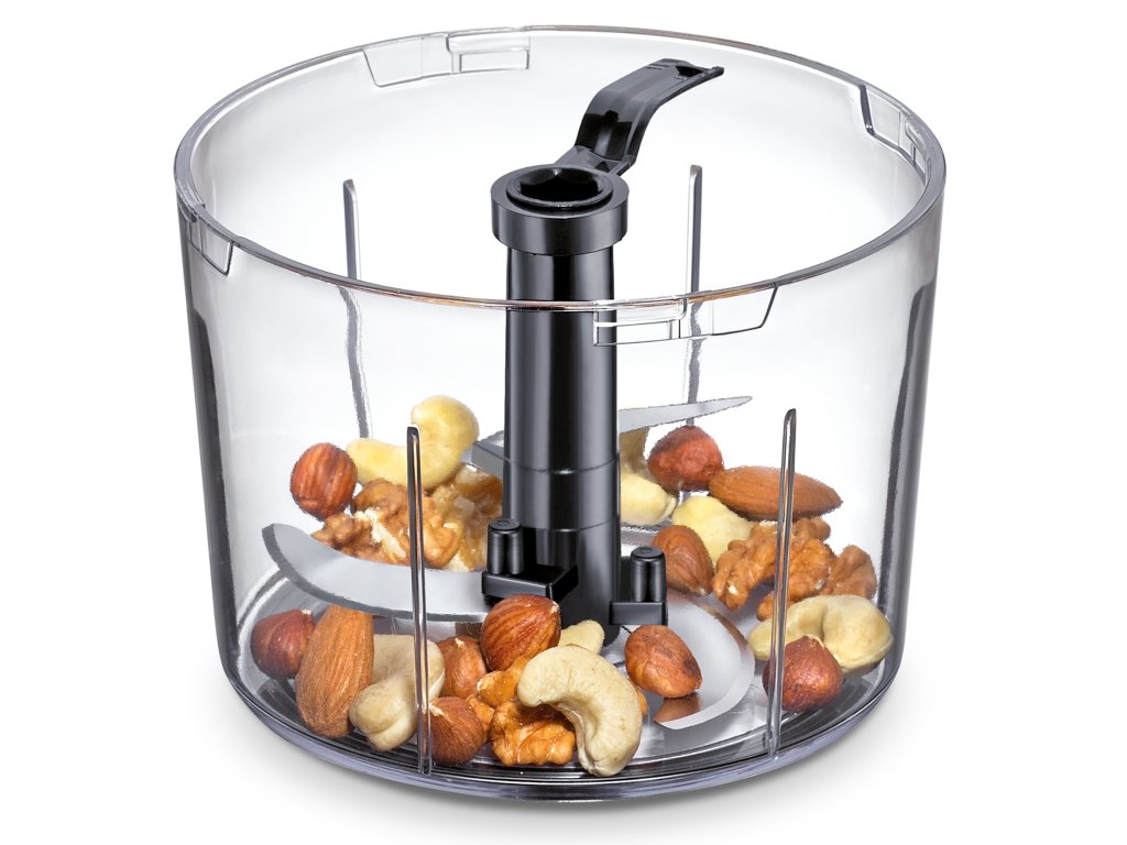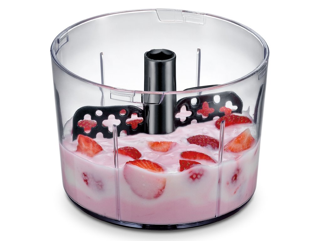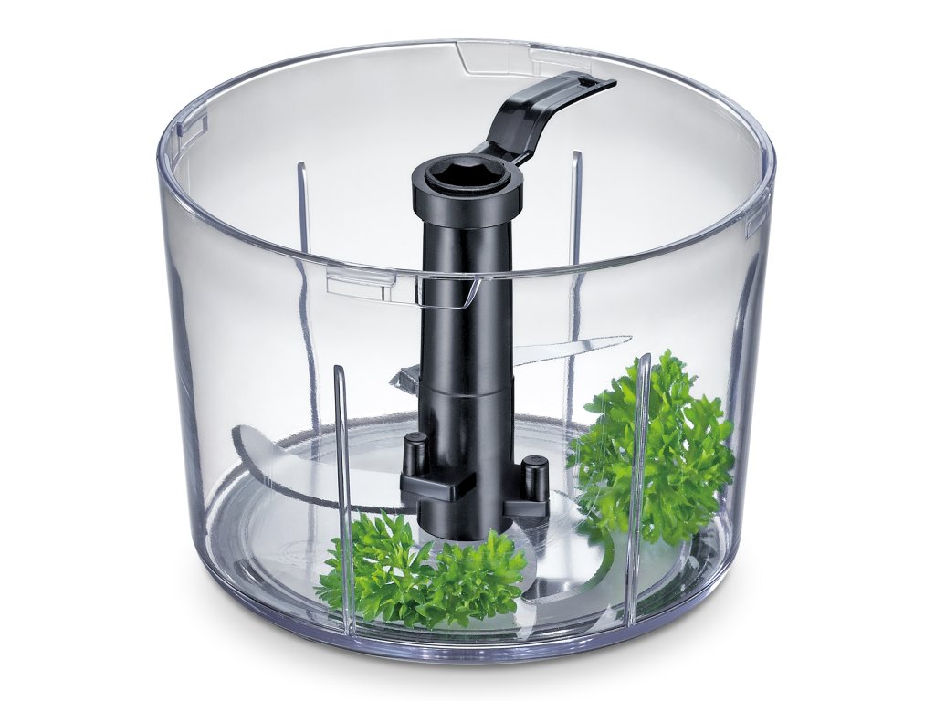 Během okamžiku nakrájí ovoce, zeleninu, cibuli, čerstvé bylinky a koření. Ostré čepele si poradí i s vařeným masem nebo rybami, sýry a ořechy. Přiložená míchací vložka je ideální pro mixování omáček a polévek, dresinků, dipů nebo dezertů. Balení obsahuje víčko kráječe s manuálním pohonem, sekáček, míchací metlu.