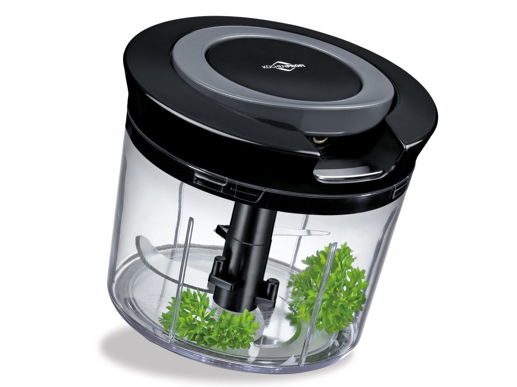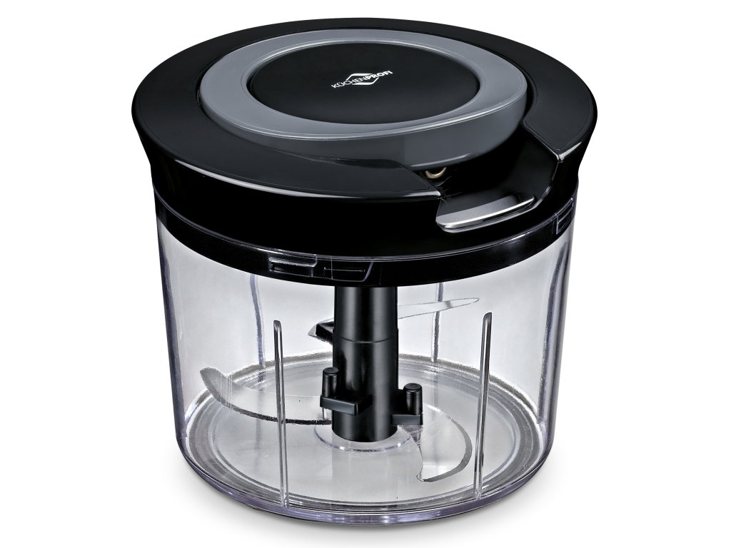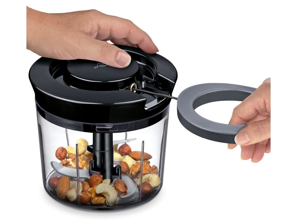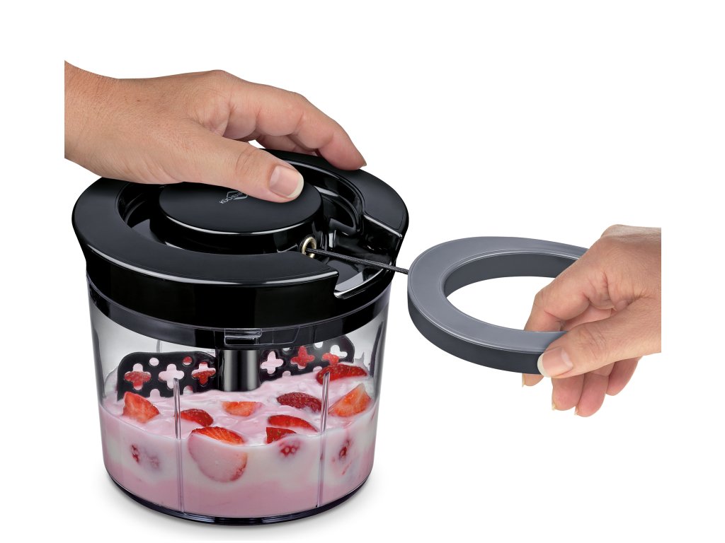 Černý multifunkční kráječ TURBO od KÜCHENPROFI je skutečný pomocník. Naseká ovoce, zeleninu, cibuli, čerstvé bylinky a koření během chvilky. Ostré čepele si snadno poradí i s vařeným masem nebo rybami, sýrem a ořechy. Součástí dodávky je mixovací nástavec, který je ideální pro míchání omáček a polévek, dresinků, dipů nebo dezertů. Díky mechanismu ovládanému kabelem se neuvěřitelně snadno používá. Abyste si svůj multifunkční kráječ užívali po dlouhou dobu, doporučujeme jej jemně čistit ručně teplou vodou s trochou saponátu na nádobí.