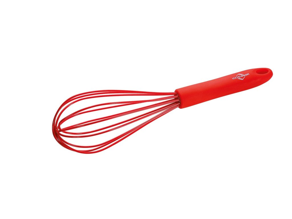 TREND Červená metla na šlehání vyrobená ze silikonu o rozměru 26,5x5,5x2,5 cm vhodná na teflon. Je žáruvzdorná až do 270 ° C a snadno se čistí. Možnost mytí v myčce nádobí.