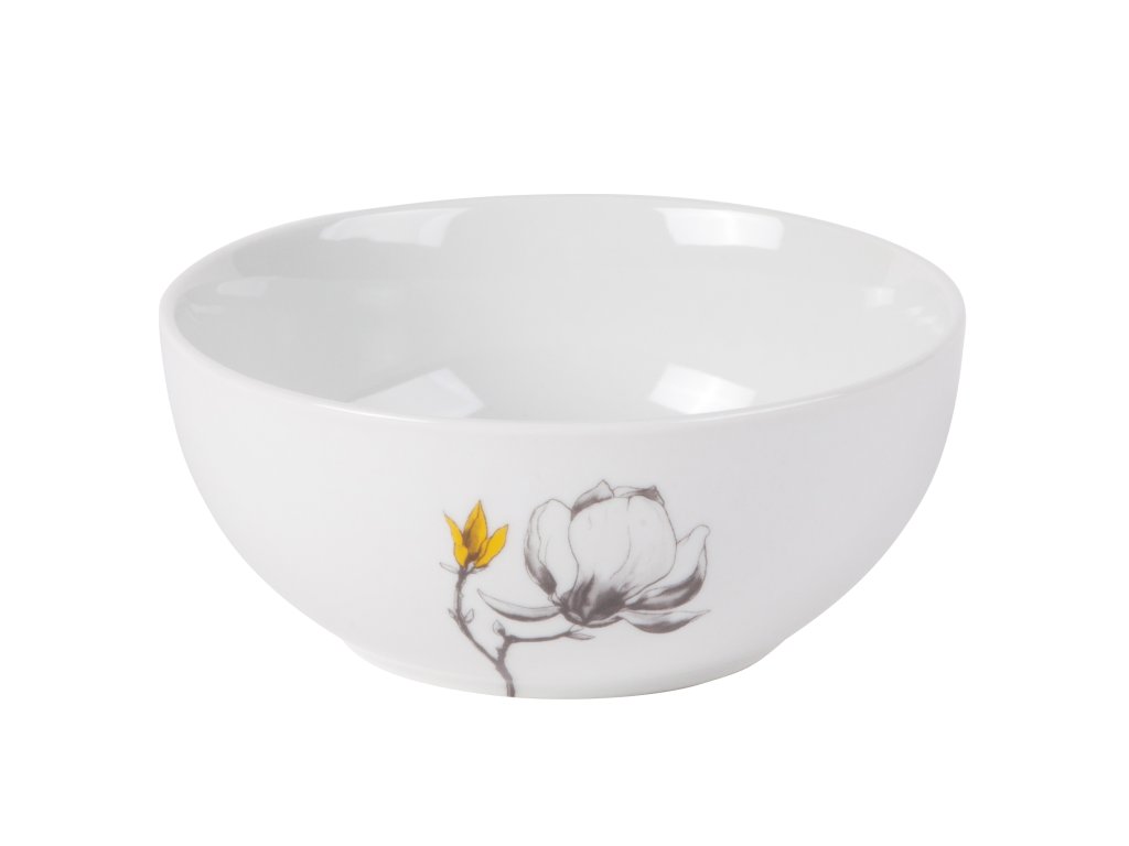 Porcelánová miska na cereálie, kompot nebo salát o objemu 450 ml v bílé barvě s nádhernými květy magnolie v šedo-žluté barvě zkolekce porcelánu TWIG.