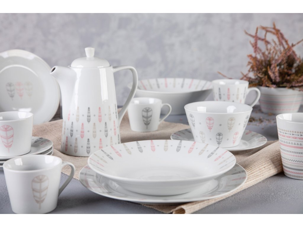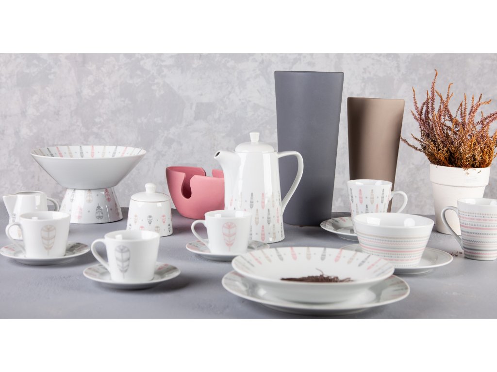 Kolekce porcelánu PÍRKA přináší veselý a moderní motiv pírek v šedé, růžové a smetanové barvě. Můžete vybírat talíře, šálky s podšálky, hrnky, cukřenky, mléčenky i konvice na kávu ve dvou dekorech. Samostatná pírka nebo pírka s totemem.