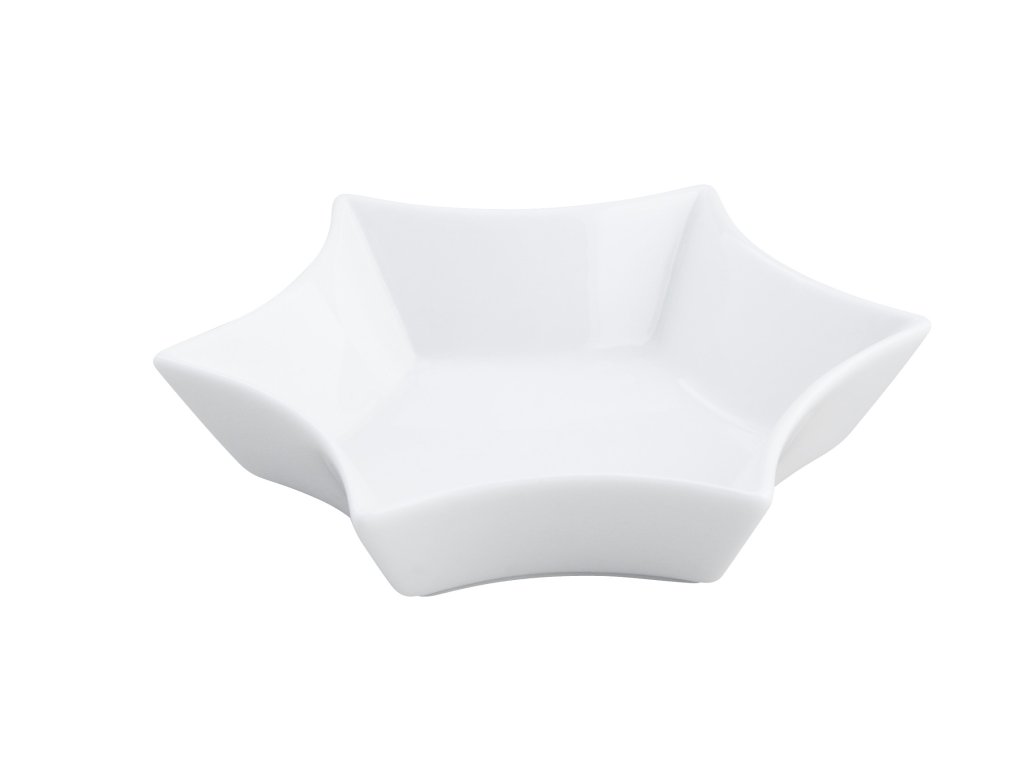 Porcelánová miska ve tvaru hvězdičky o rozměrech 12,6x11x12,6 cm v bílé barvě je vhodná jako aranžovací miska pro svíčky nebo také jako servírovací miska na oříšky, bonbóny.