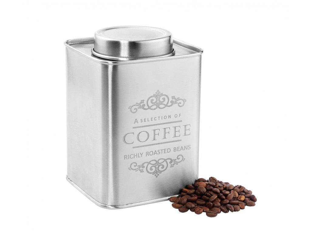 Dóza na skladování kávy z nerezové oceli pro 500 g kávy o rozměru 12x12x17 cm.