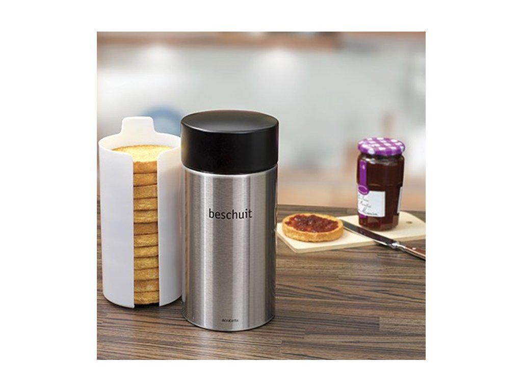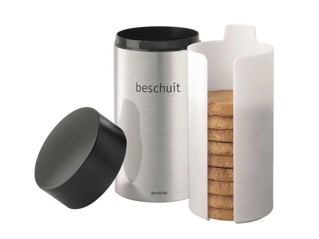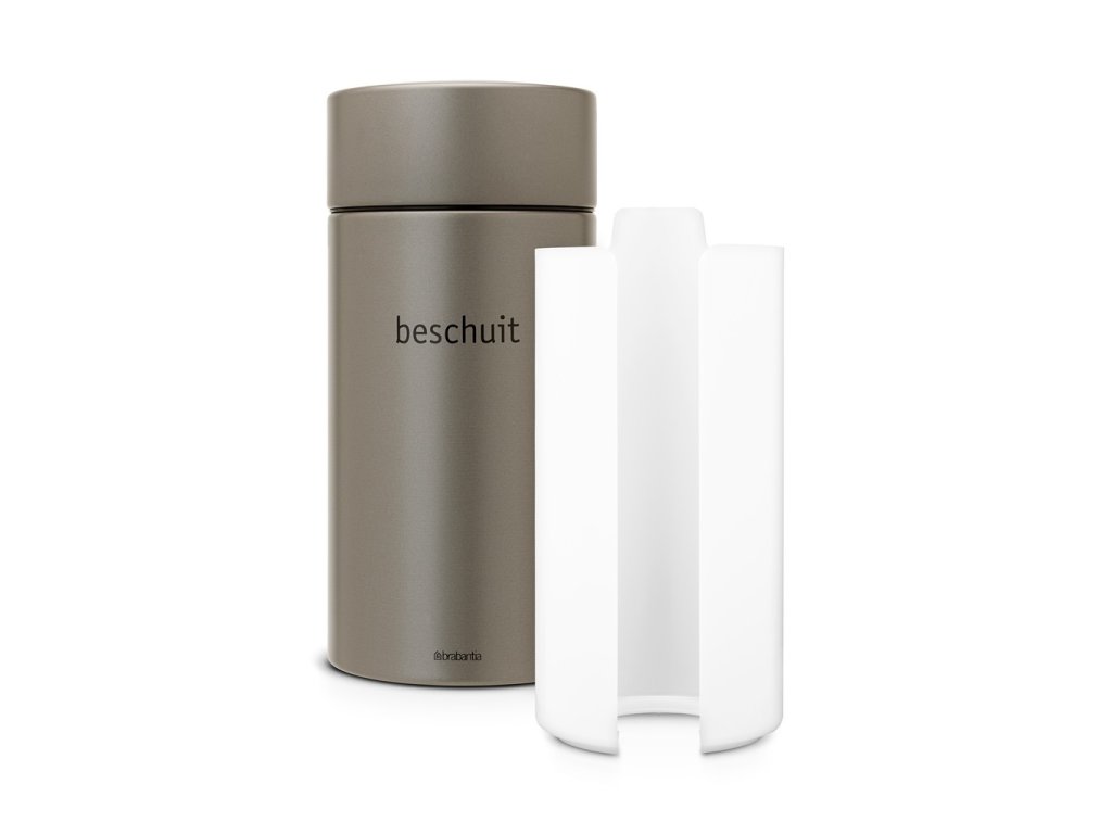 Vysoce funkční a praktická kuchyňská dóza o objemu 1700 ml v platinové barvě je skvělým způsobem pro hygienické skladování potravin v kuchyni. Tato válcová nádoba od holandské značky Brabantia má objem 1,7 litru. Můžete v ní skladovat například sušenky, suchary a ostatní ingredience. Jen v této dóze zůstane vše díky speciálnímu „klikacímu“ uzávěru stále čerstvé. Je to funkční a odolné řešení k uchovávání sušenek, suchrů atd. Dóza má vysouvací vložku, díky níž pohodlně vyndáte suchary. Za jednoduchou údržbu vděčíme hladkému vnitřnímu povrchu.