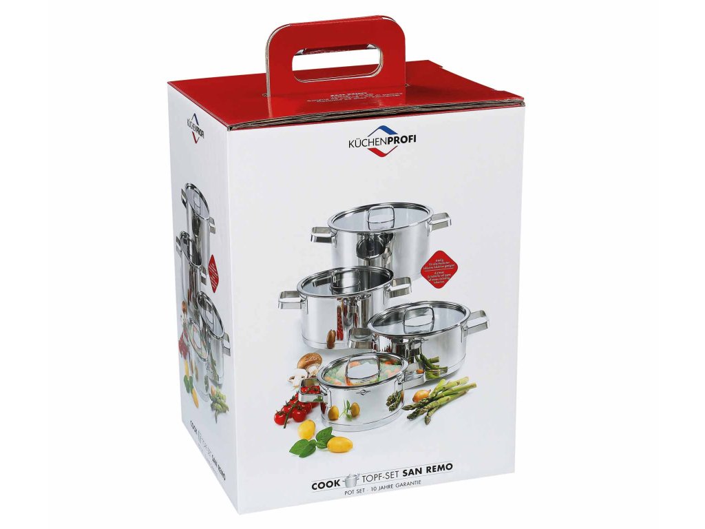Pokud vaříte pro své přátele nebo rodinu, je sada hrnců SAN REMO ideální. Tři hrnce na maso a pekáč dělají vše pro to, aby se vaše pokrmy vydařily. Se čtyřmi různými velikostmi existuje ta správná velikost pro každou příležitost a pro každou varnou desku. Sada těchto 4 hrnců je vhodná na všechny typy sporáků včetně indukce. Extra pevná vícevrstvá základna rovnoměrně distribuuje teplo pro dokonalý výsledek. Tepelně izolační rukojeti, vnitřní stupnice a víko z bezpečnostního skla. Víko z bezpečnostního skla pomáhá s energeticky úspornou přípravou a obsah máte vždy na očích. Tepelně izolační rukojeti jsou z nerezu a můžete za ně chytit a nespálíte se.