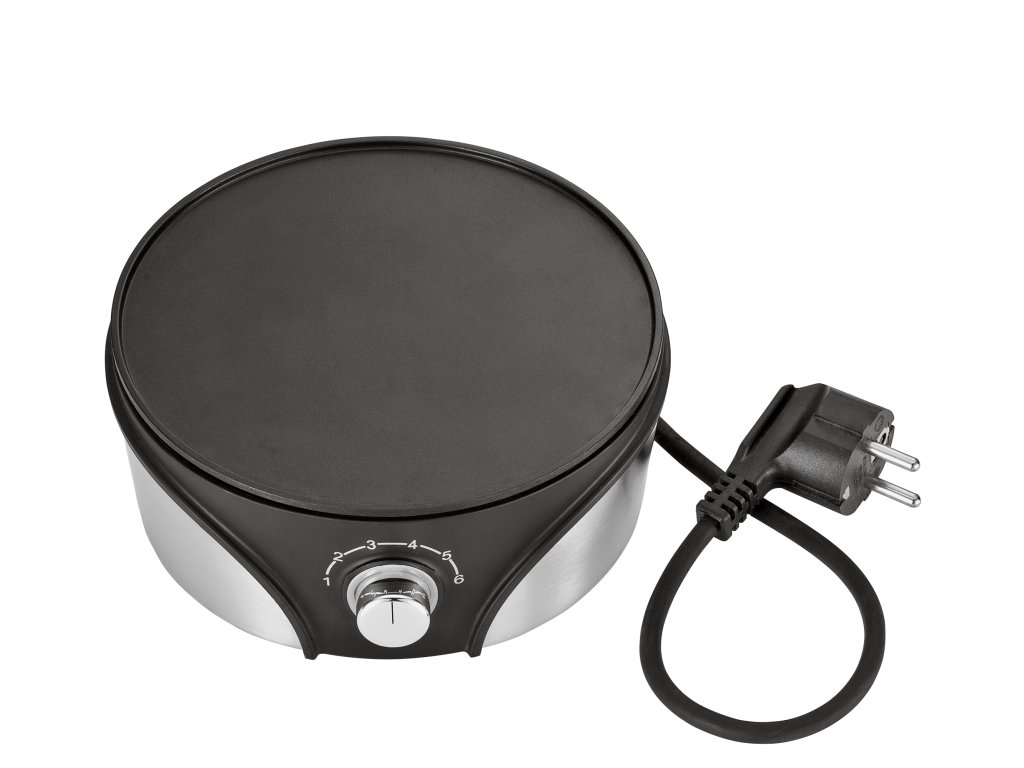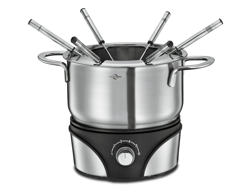 Ochranný kryt proti stříkající vodě. Stojan s plynule nastavitelnou regulací teploty od 50 °C do 210 °C. 6 vidliček na fondue s označením.