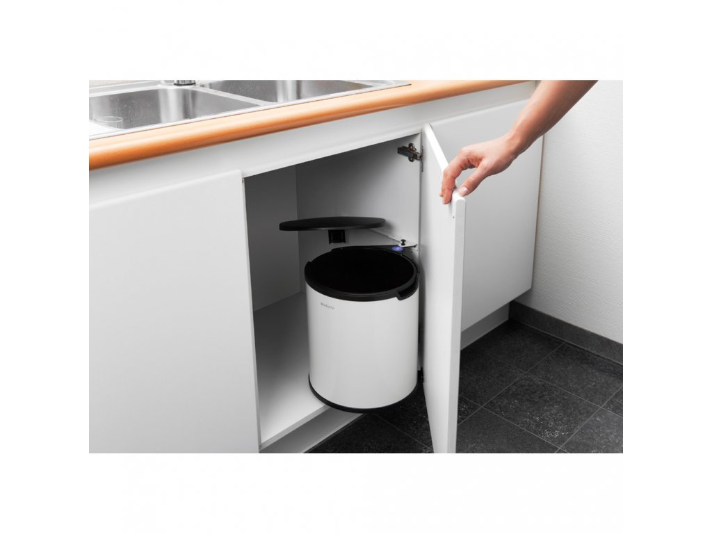 Vestavný odpadkový koš o objemu 15 l v nadčasové bílé barvě je vyrobený z antikorozního materiálu. Snadno vyprazdňuje a čistí. Má vyjímatelné plastové vědro s odolnými úchyty. Víko odpadkového koše se otevírá a zavírá s dvířky skříňky automaticky. Můžete použít na pravé i levé dveře.
