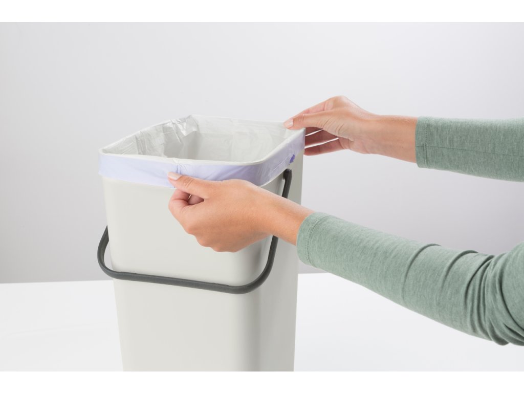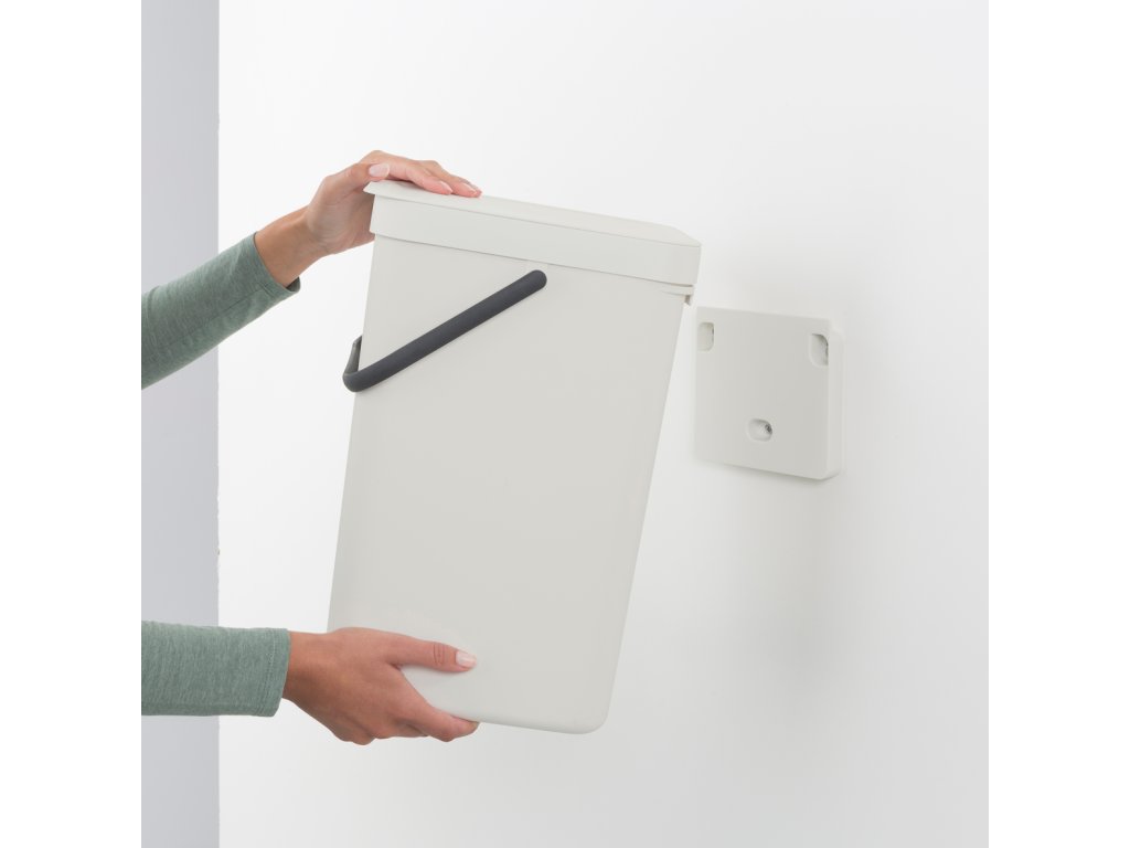 Můžete ho jednoduše připevnit na zeď nebo volně postavit na zem. Závěsný úchyt je součástí balení. Jednoduše se s ním manipuluje při vysypávání díky velké rukojeti a chytrému držadlu, které je umístěno zespodu koše. Víko koše dobře drží otevřené a také ho můžete z koše sejmout. Zdarma jsou přiloženy speciální sáčky PERFECTFIT, které se do tohoto koše používají.