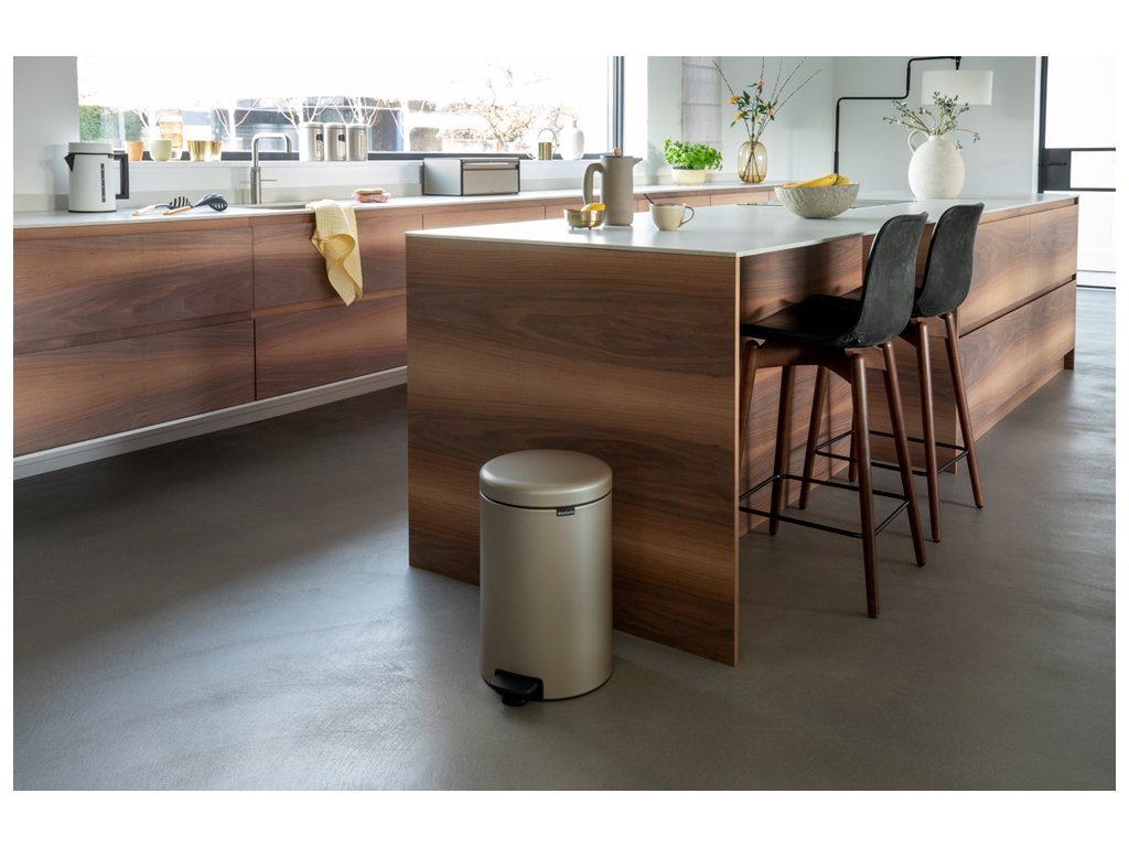 Pedálový koš na odpadky newIcon o objemu 20 l v metalické zlaté barvě od výrobce Brabantia je ideální pro použití v kuchyni, obývacím pokoji, kanceláři nebo hale. Je to nejvíce používaný koš vůbec. Velký otvor zajistí snadnou likvidaci vašeho odpadu bez rozsypání.