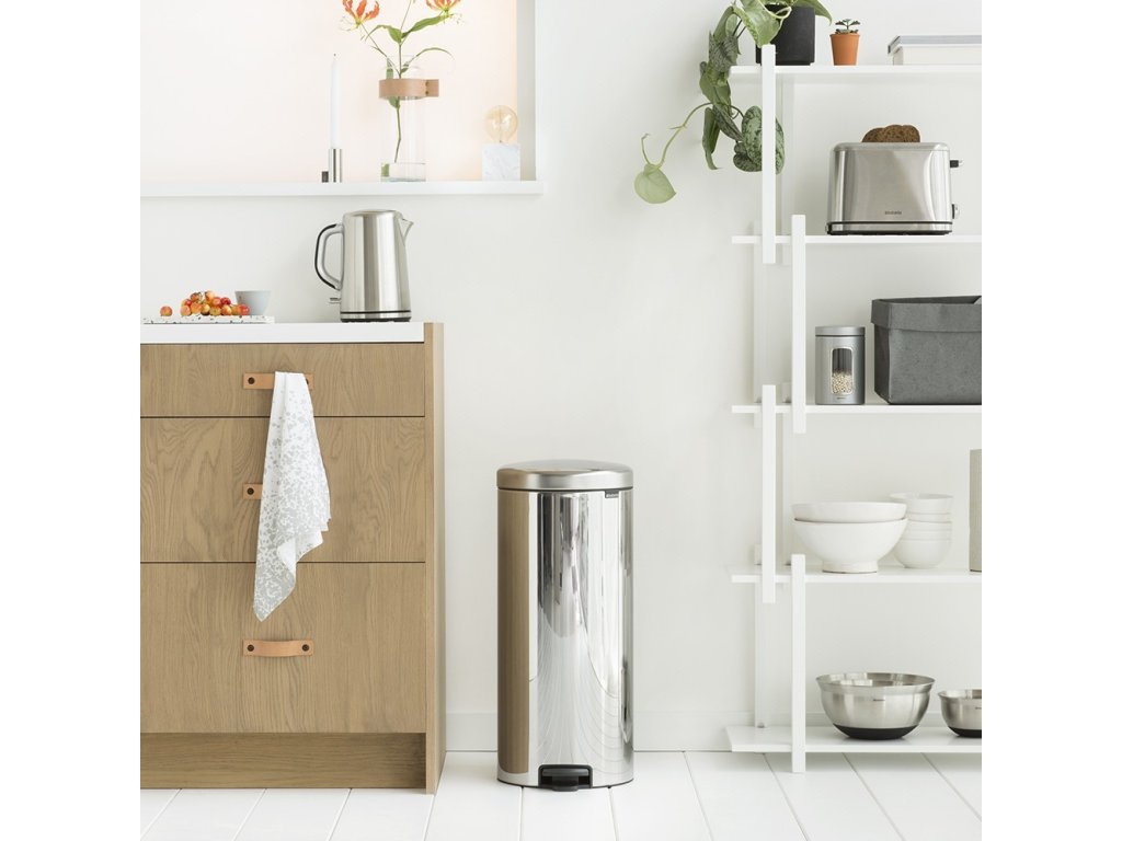 Pedálový koš na odpadky newIcon o objemu 30 l v provedení lesklá ocel od výrobce Brabantia má dostatečnou kapacitu v rušném rodinném domě, ale je to i skvělá volba pro kuchyni,vaši dílnu, ale i kancelář.