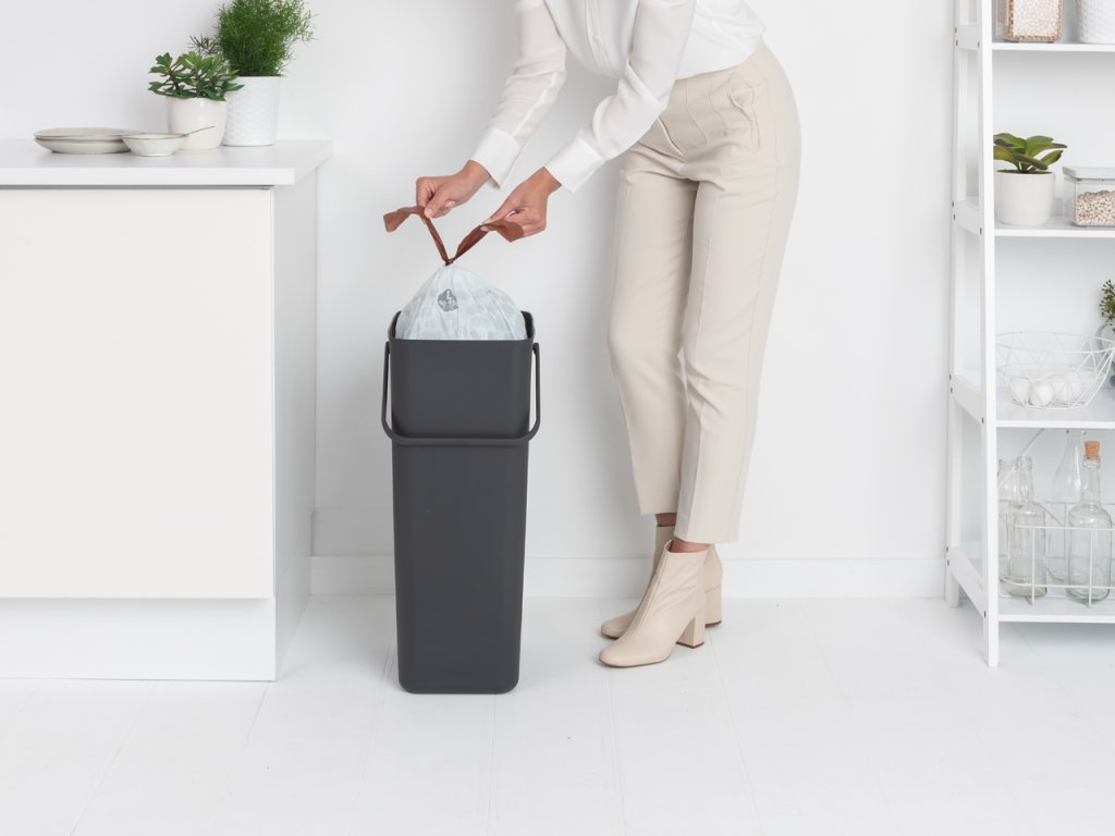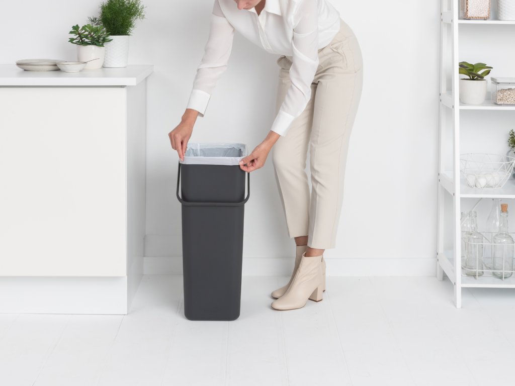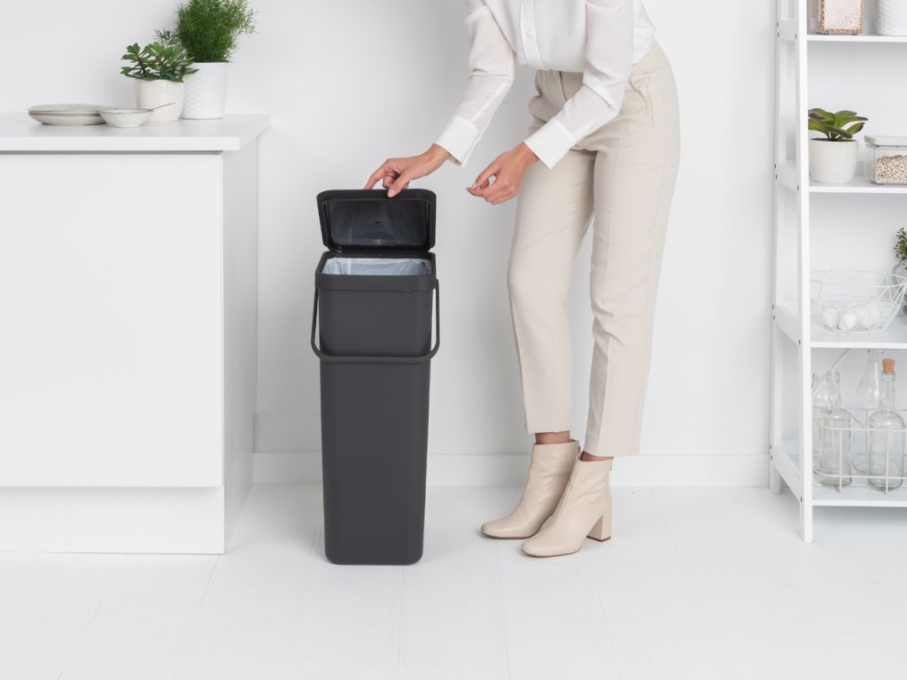 Jednoduchý praktický plastový odpadkový koš na tříděný odpad Sort & Go o objemu 40 l v nadčasové šedé barvě využijete nejen doma, ale i v zaměstnání. Je vhodný také do kuchyně na menší bio odpad.