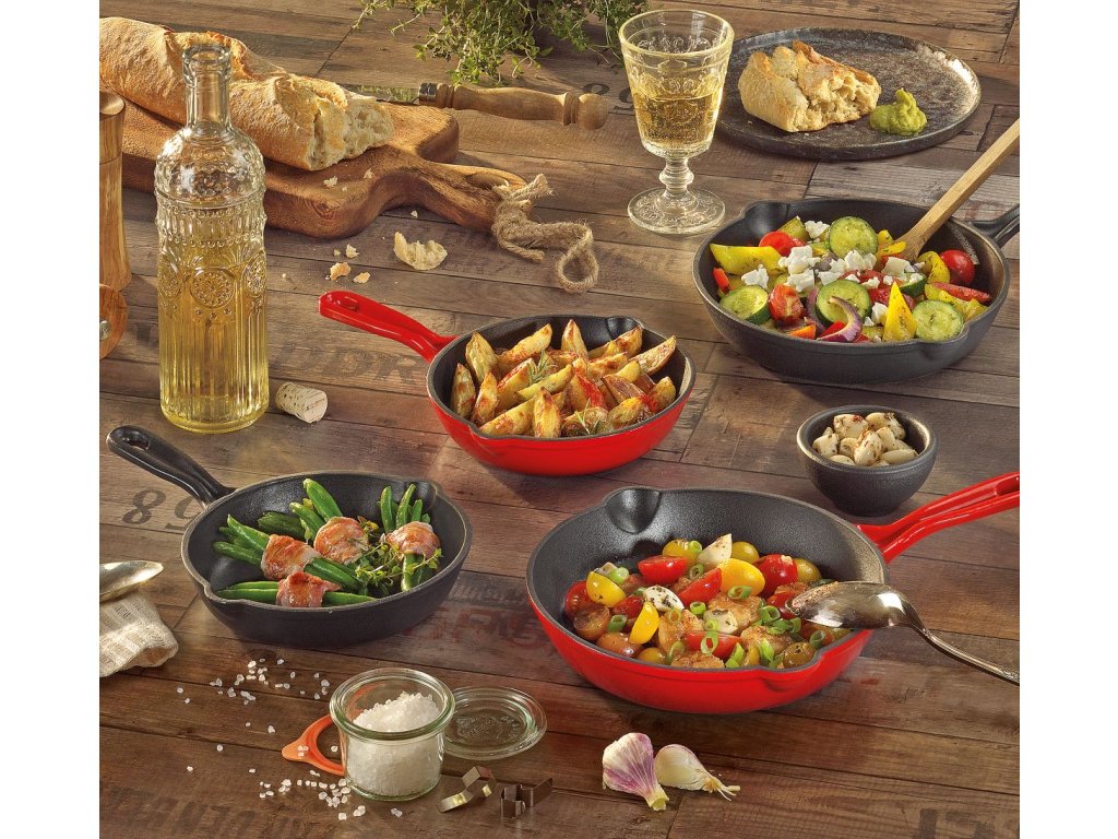 Receptem na úspěch litinových pánví PROVENCE od KÜCHENPROFI je její materiál a sofistikované zpracování. Smaltovaná litina je vysoce ceněna profesionálními kuchaři, protože rychle absorbuje teplo a optimálně ho rozvádí. Po krátké době můžete snížit teplotu; křehké maso, ryby a šťavnatá zelenina se vaří šetrně a chuť je zachována. A z energeticky úsporné přípravy těží i domácí rozpočet. Jak se na profesionální nářadí sluší a patří, pánev je vhodná do vysokých teplot, takže váš steak dopadne dokonale. Litinové pánve PROVENCE nabízíme v mnoha provedeních.