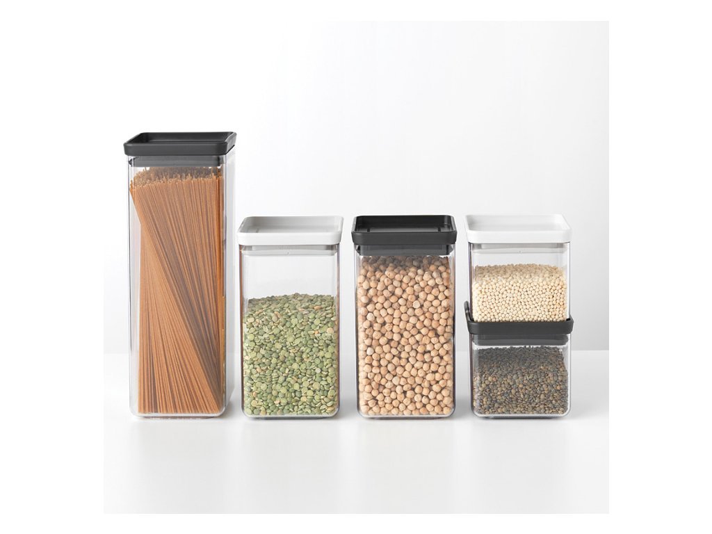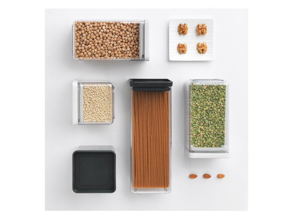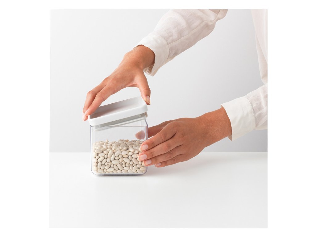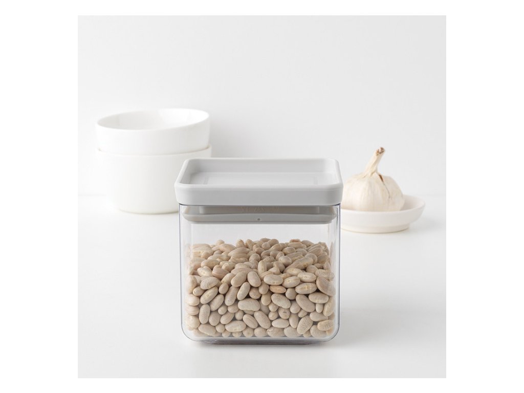 Kvalitní plastové vzduchotěsná dóza SQUARE o objemu 700 ml se světle šedým víčkem od holandské značky Brabantia je vyrobena z kvalitního a odolného plastu. Je vhodná pro skladování různorodých potravin jako jsou těstoviny, luštěniny, rýže, cukr, kakao atd. Silikonový těsnící kroužek na víku zajistí delší čerstvost potravin a chrání je před vlhkostí. Praktický tvar umožňuje dózy stohovat na sebe a šetřit tak místo ve spíži či zásuvce.