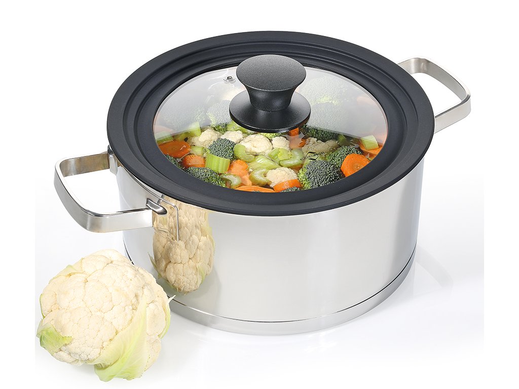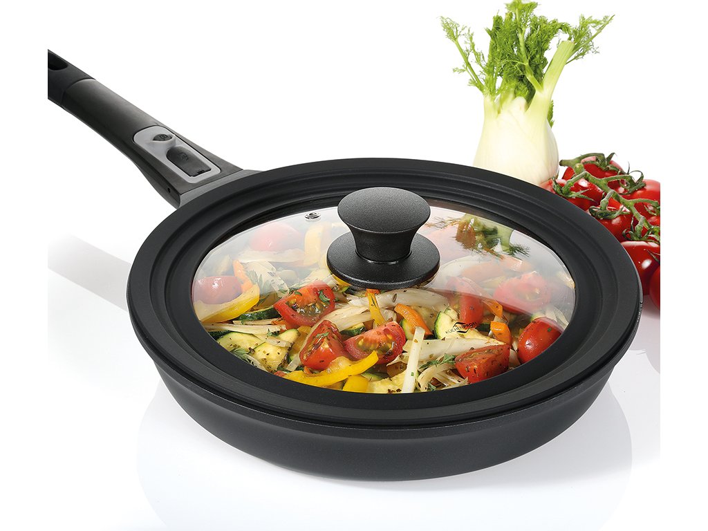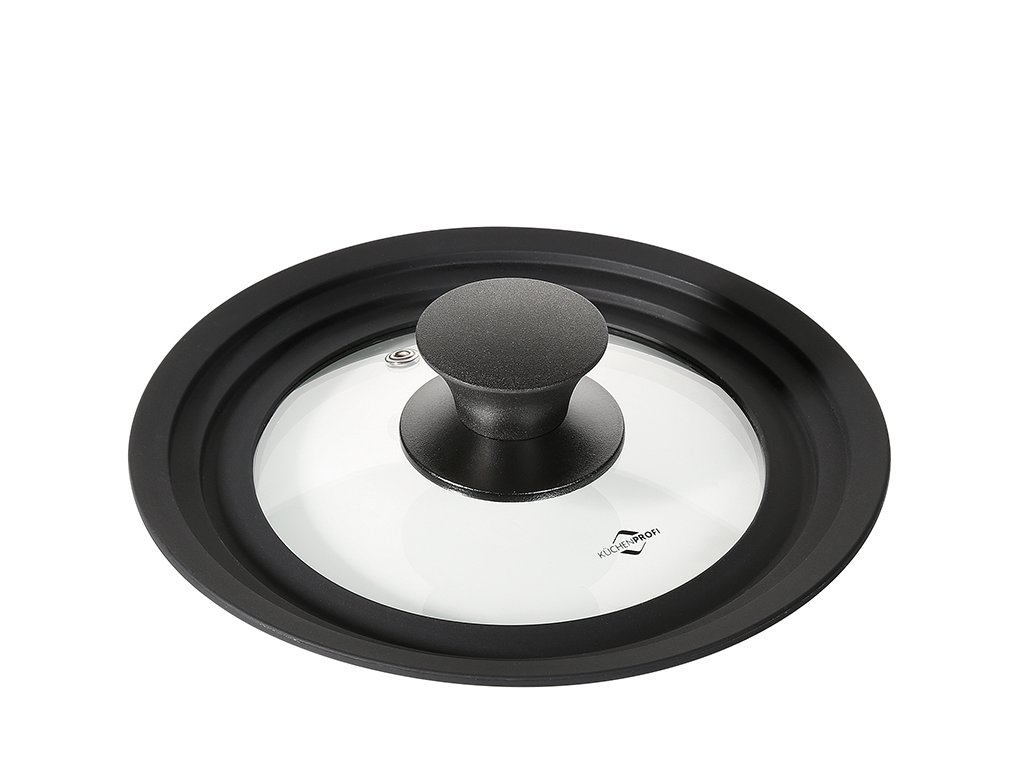 Skleněná poklička vhodná pro nádobí o průměru 16-20 cm díky stupňovitému tvaru. Žáruvzdorná do 250 °C. vyrobená z borosilikátového skla, silikonu a plastu.
