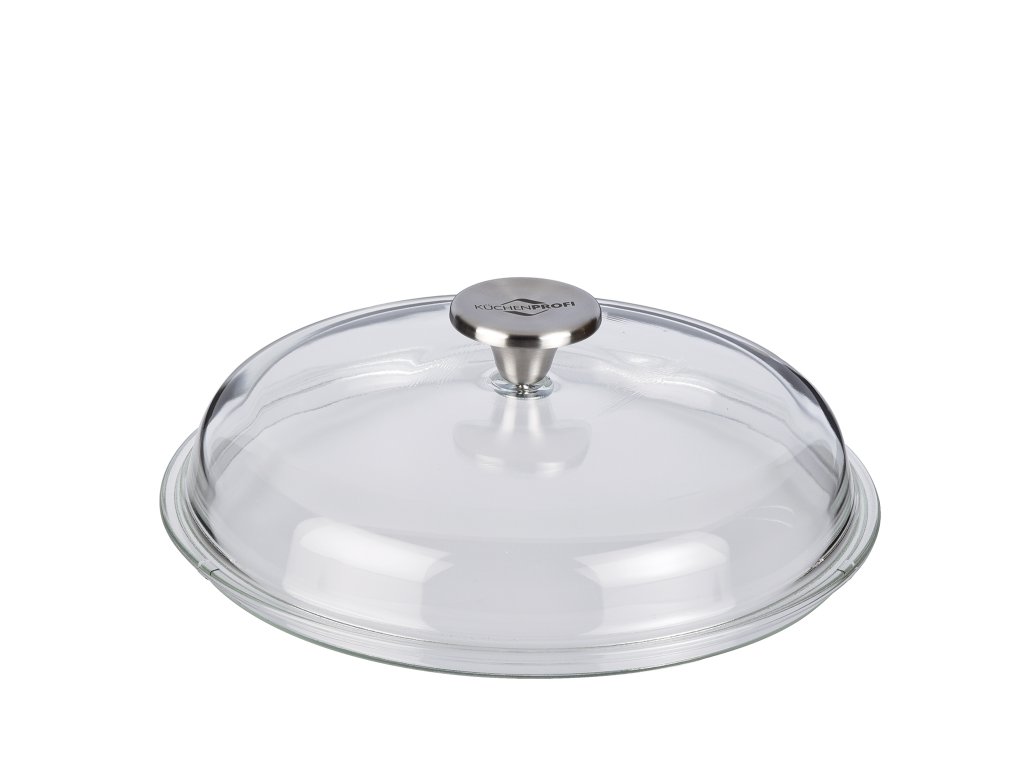 Skleněná poklička na standartní nádobí o průměru 24 cm žáruvzdorná do 250 °C. Borosilikátové sklo, knoflík na poklici z nerezové oceli.