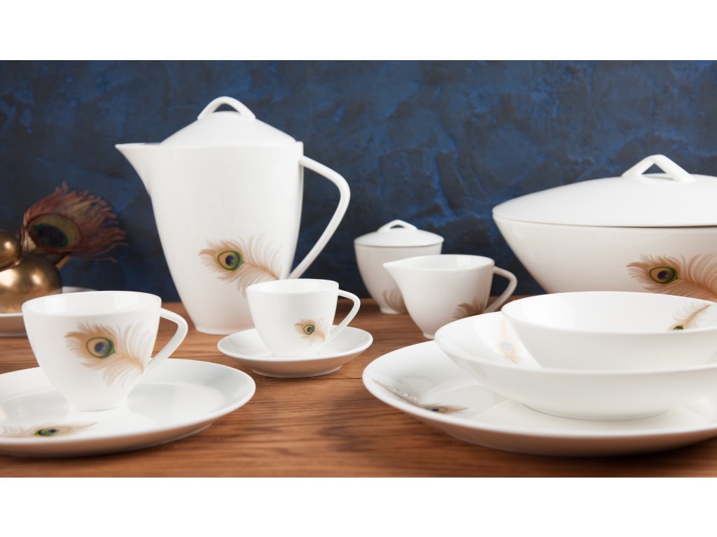 Hlavním designovým prvkem kolekce PAVONE je paví pero v metalické zlaté barvě s nádherným vybarvením pavího pera na bílém porcelánu - kolekci porcelánu NOBLE.