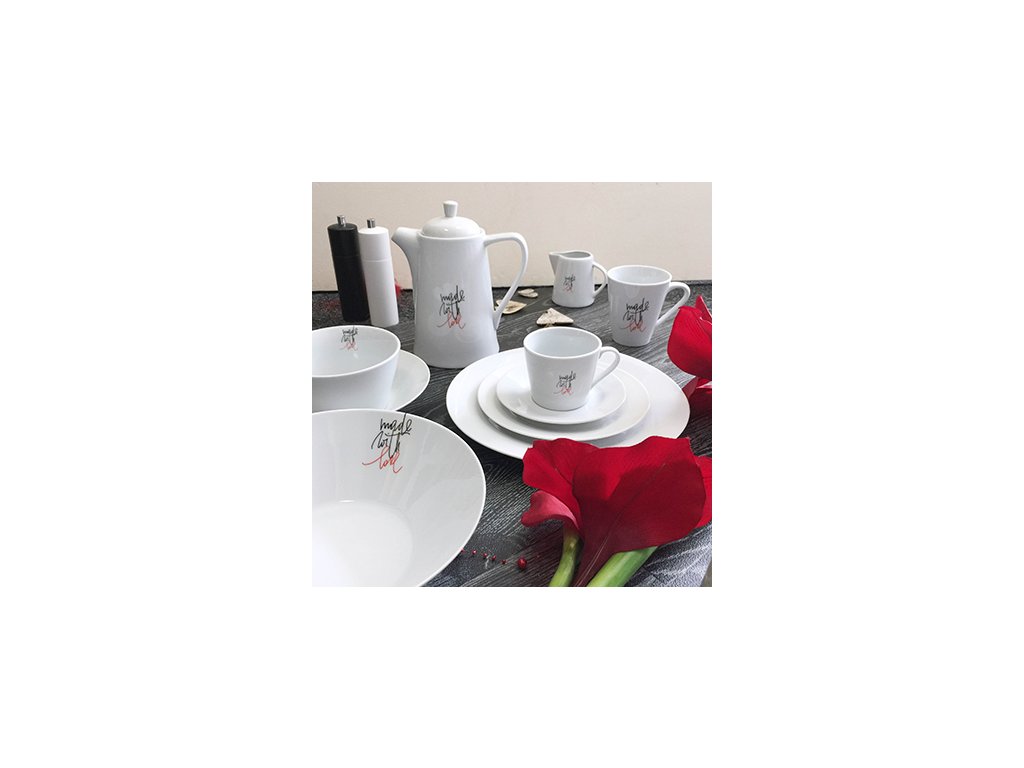 Dekor made with love kolekce porcelánu LOVE je černo-červeným jemným písmem a snadno s ním zkombinujete další doplňky.