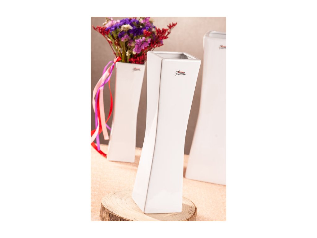 Krásná porcelánová váza CARRÉ v zajímavém tvaru výšky 35 cm s krásně lesklou, bílou a pevnou glazurou, která nepropouští vodu. Naspod vázy jsou nalepena filcová kolečka, která zabraňují poškrábání nábytku. Vázička se hodí do každého interiéru.