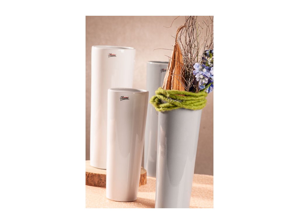 Bílé vázy CONI si můžete vybrat ve dvou velikostech: 9x25 cm, a 10,5x31 cm.