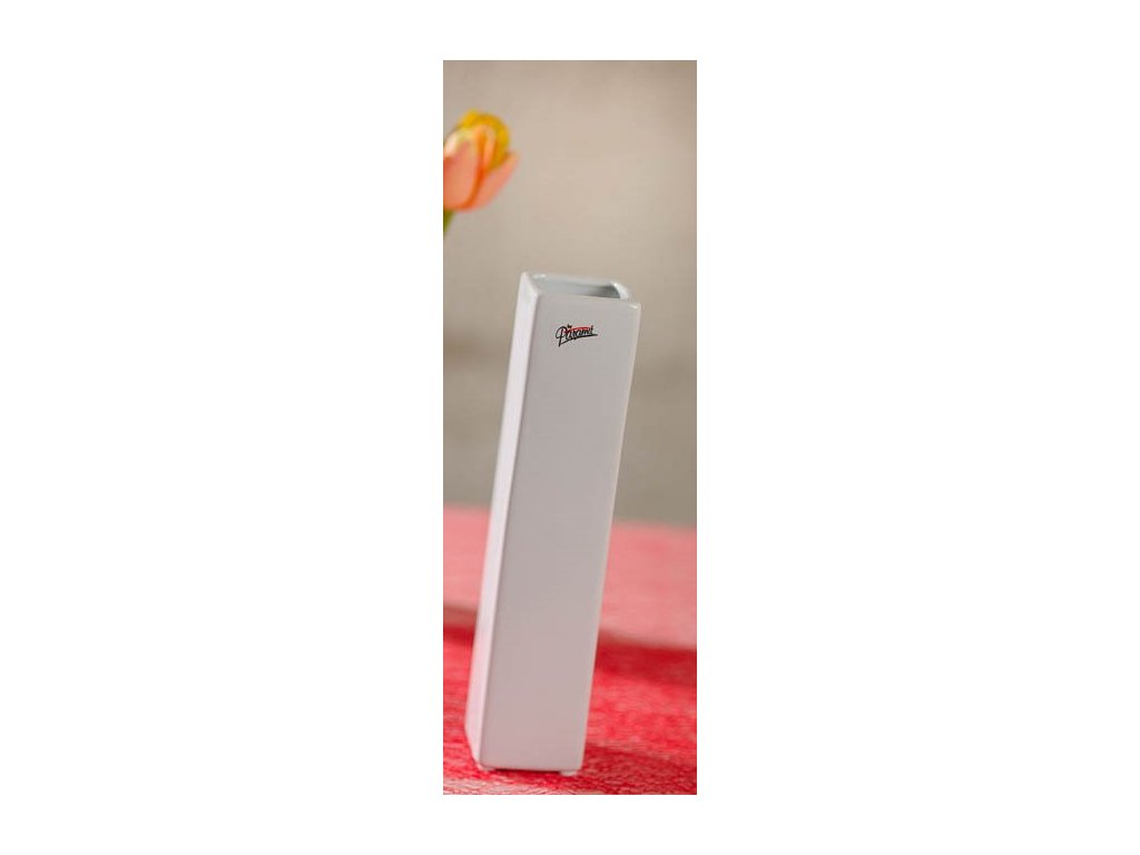 Krásná porcelánová váza QUADRO výšky 25 cm, šířky 5,5 cm s krásně lesklou, bílou a pevnou glazurou, která nepropouští vodu. Naspodu vázy jsou nalepena filcová kolečka, která zabraňují poškrábání nábytku. Vázička se hodí do každého interiéru.