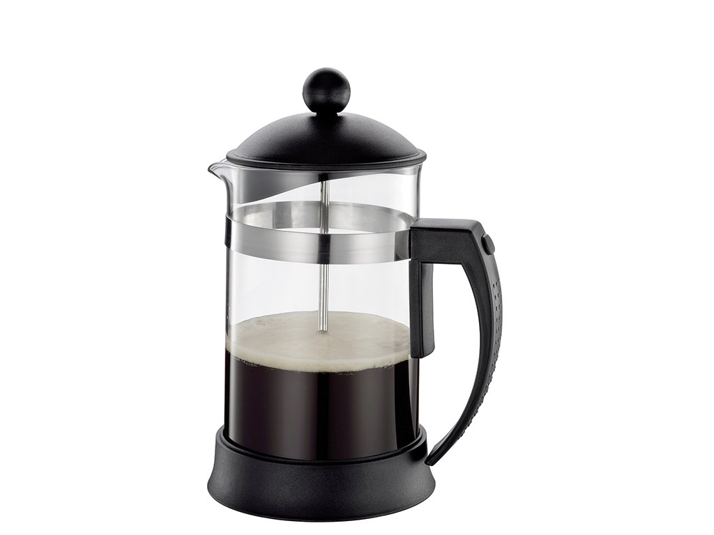 Pres na kávu MARIELLA na 6 šálků o objemu 0,8 litru vyrobený z černého plastu.
