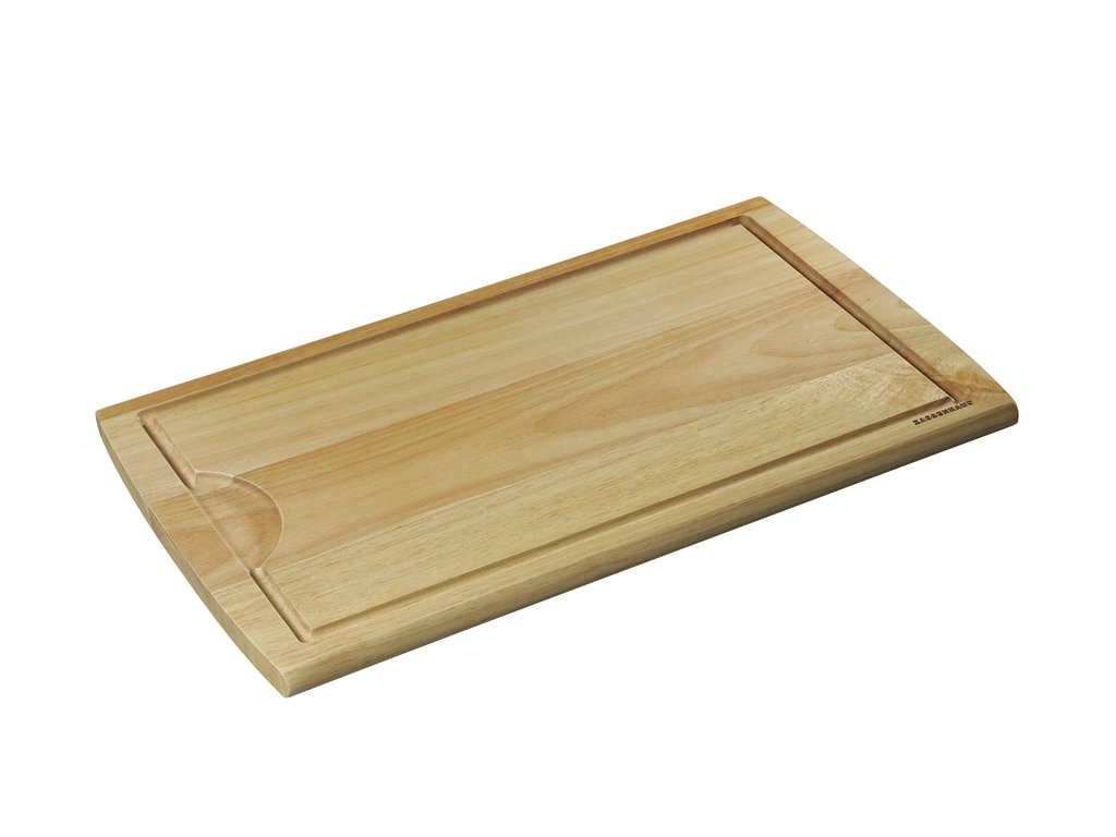 Prkénko na krájení vyrobené ze dřeva kaučukovníku o rozměru 49 x 30 x 2 cm s drážkou na zadržení tekutin z krájených potravin.