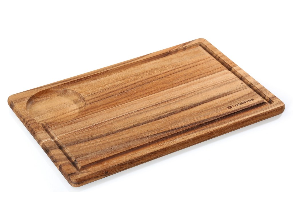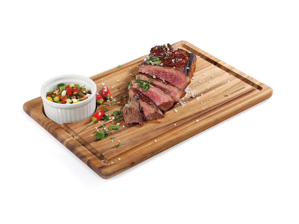 Krájecí a zároveň servírovací prkno s velkou drážkou na tekutiny a prohlubní pro misku na salát nebo dip o rozměru 36x23x2 cmod špičkové německé značky Zassenhaus je skvělé pro servírování nejen steaků, ale i pečených žeber a grilovaných kolen. Vhodné nejen pro domácí použítí, ale i gastro provozy. Do prohlubně se vejde i malá miska do průměru 8 cm naplněná mini salátem, vaší domácí salsou nebo ančovičkovým máslem, které doprovází bistro klasické steakové hranolky.
