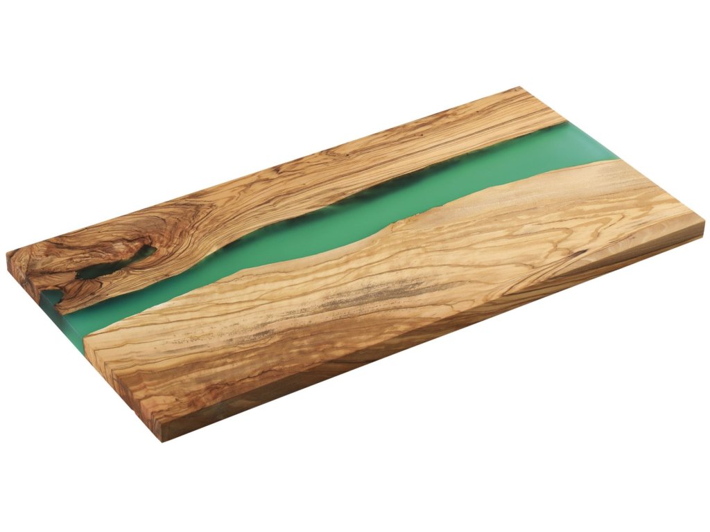 Pečlivě ručně vyrobené servírovací prkénko z olivového dřeva a barvené zelené pryskyřice bezpečné pro styk s potravinami. Rozměry: 45x22x1,5 cm.