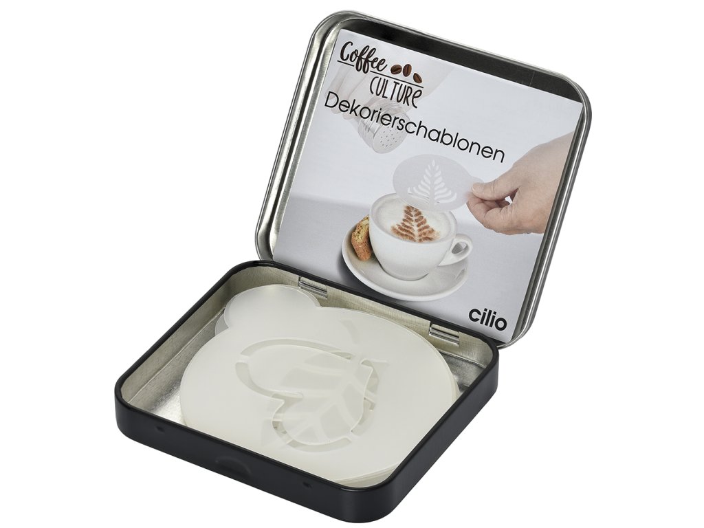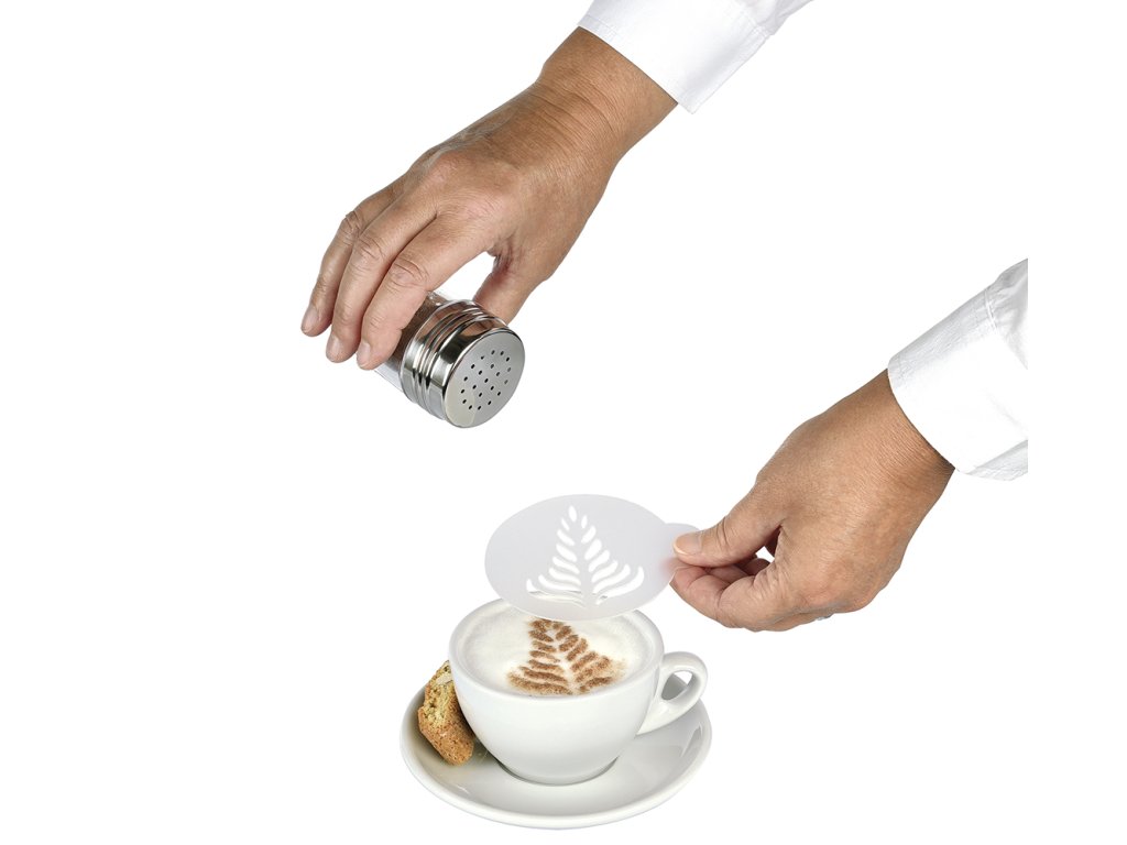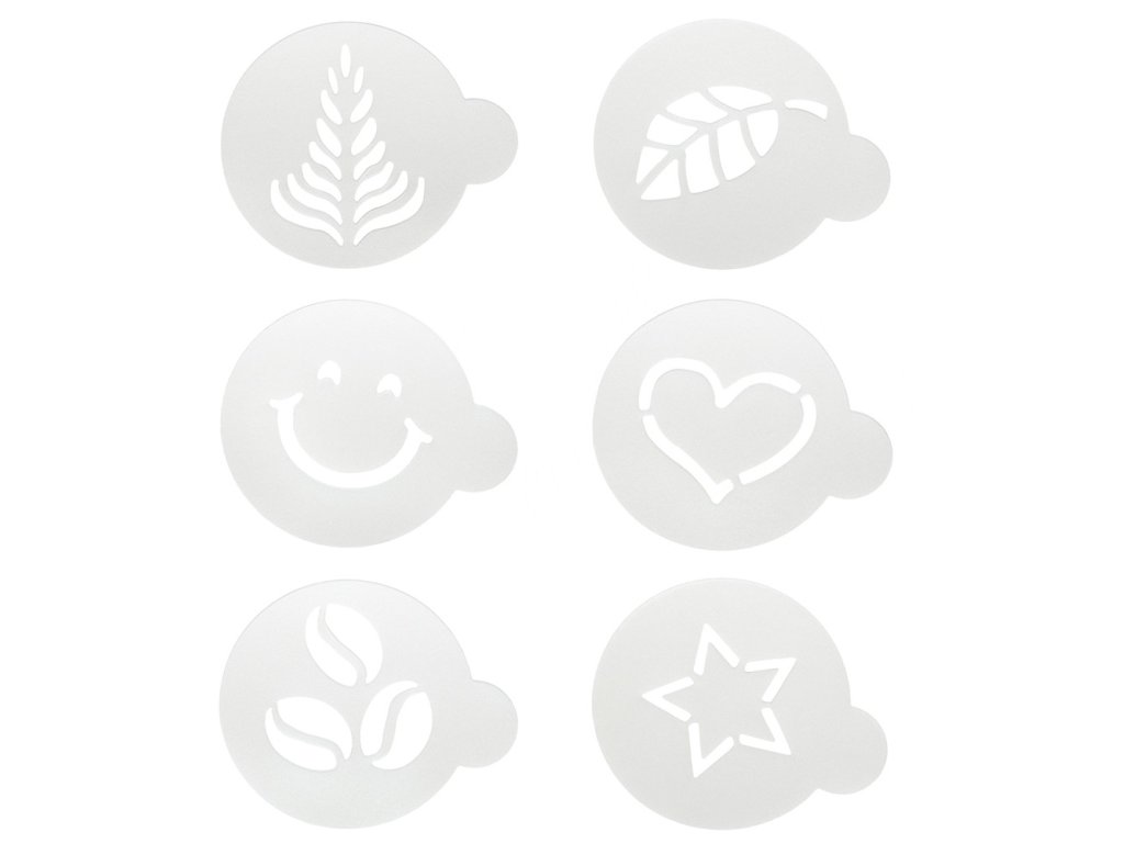 Zdobící šablony na cappuccino, latté macchiato nebo horkou čokoládu - souprava 6 ks. Jsou vyrobeny z vysoce kvalitního plastu. Můžete si vybrat ze šesti různých motivů: hvězdy, srdce, baristy, obličeje, listu, kávového zrna. Baleny v praktické krabičce, kterou budete mít vždy po ruce.