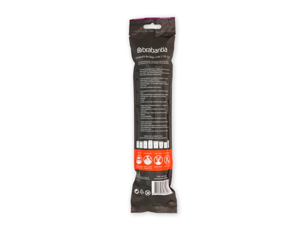 Igelitové pytle do odpadkových košů o objemech 10 až 12 l od Brabantia - typ C mají v roli 10 ks a jsou navrženy přímo na míru vašeho odpadkového koše Brabantia. Pytle jsou vyrobeny z kvalitního plastu (HDPE - high density polyethylen) a jsou opatřeny stahovací páskou, díky níž je manipulace snadná. Jednoduše pytel do koše vložíte a zase vyjmete.