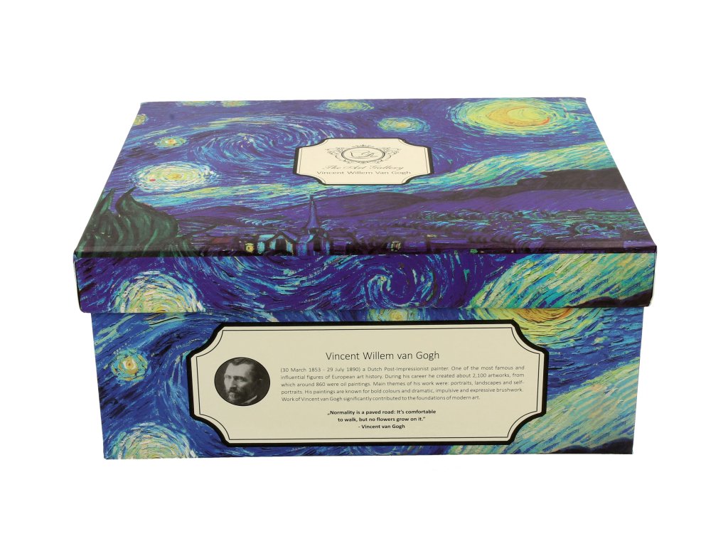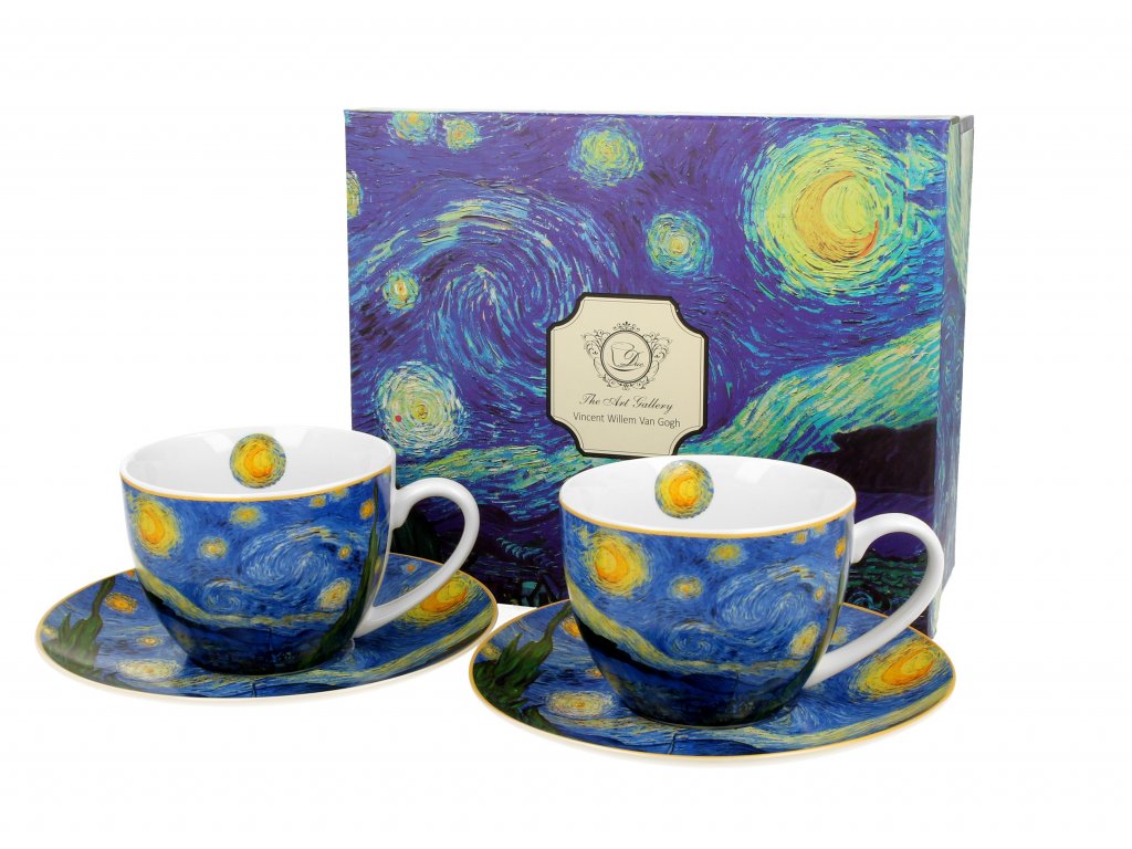 Krásná porcelánová souprava STARRY NIGHT od Van Gogha obsahuje presso šálky s podšálkem - 2 ks objemu 90 ml ze série Art Gallery, která se je zdobena reprodukcí van Goghova obrazu " Hvězdná noc "., a je vyrobená z úžasného New Bone China (jemného kostního porcelánu), který se vyznačuje krémovo-bílou barvou (charakteristickou pro jemný kostní porcelán) s jemným leskem a výbornou trvanlivostí.