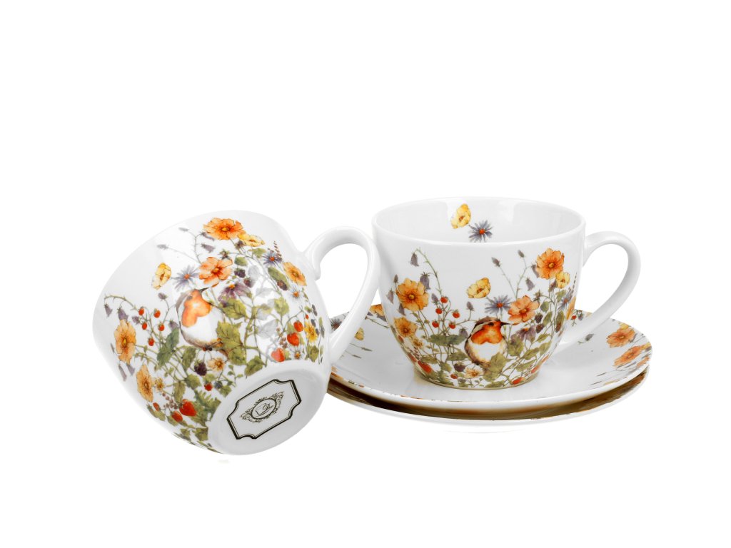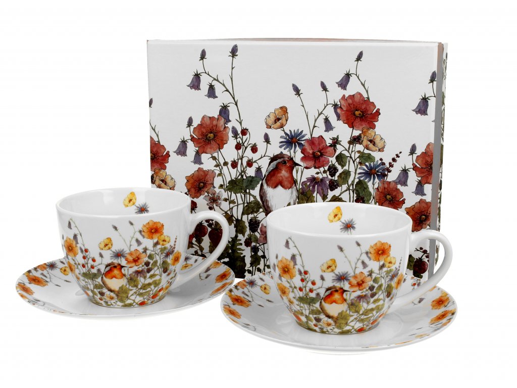 Krásná porcelánová souprava WILD BIRDS obsahuje presso šálky s podšálkem - 2 ks objemu 90 ml ze série Duo Classics, která je zdobena půvabným fragmentem polní louky, kterému dominují jarní květiny obklopující malého ptáčka, a je vyrobená z úžasného New Bone China (jemného kostního porcelánu), který se vyznačuje krémovo-bílou barvou (charakteristickou pro jemný kostní porcelán) s jemným leskem a výbornou trvanlivostí.