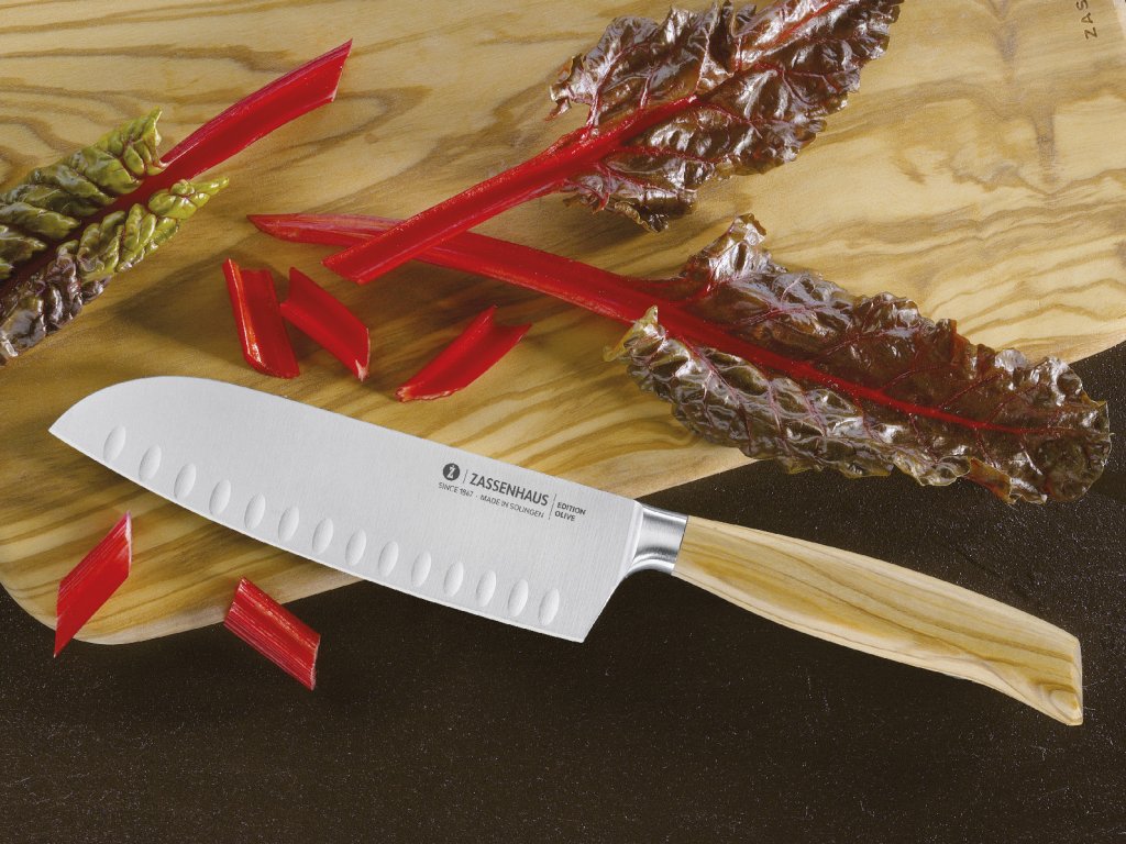 EDITION OLIVE Nůž SANTOKU s délkou čepele 16 cm snadno zvládne i náročné krájení v kuchyni i venku z řady nožů EDITION OLIVE. Celková délka 30,1 cm, délka čepele 16 cm, šířka 4,3 cm. Nůž Santoku má japonské kořeny a je všestranným nástrojem na maso, ryby a zeleninu. Dutý výbrus čepele zabraňuje přilepení jídla při krájení, mletí nebo sekání bylinek, ovoce a zeleniny.