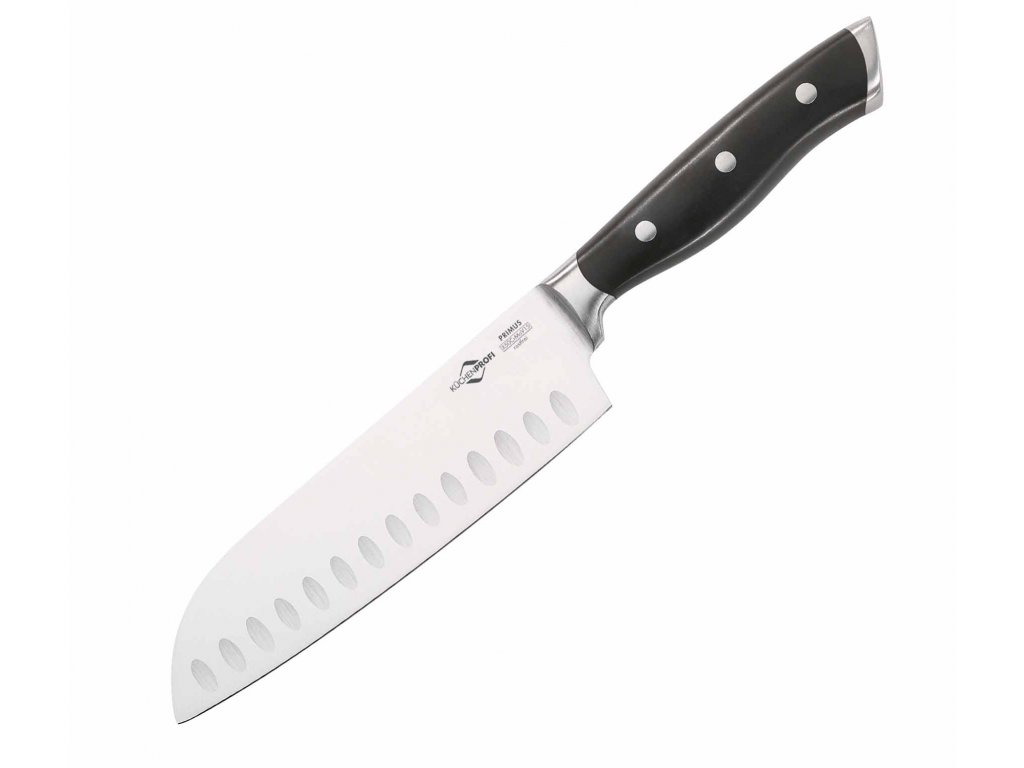 Tvrzená ocel čepele 18 cm nože PRIMUS řeže čistě, je velmi robustní a odolná proti korozi. To hovoří o nejlepší kvalitě a maximální odolnosti. Nůž stylizovaný podle japonského kuchařského nože je to pravé pro přípravu nejen asijské, ale i západní kuchyně. Dutě vroubkované ostří vytváří kapsy vzduchu, který brání extra tenkým nebo měkkým plátkům v přilepení na ostří nože. Ergonomické plastové rukojeti se zaoblenými hranami umožňují bezpečné řezání.