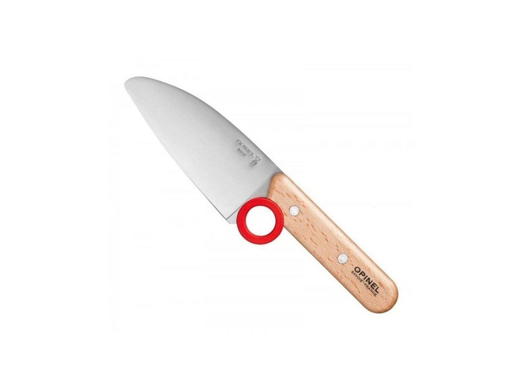 Dětský kuchařský nůž: čepel z nerezové oceli Sandvik se zaoblenou špičkou, rukojeť z lakovaného bukového dřeva, kroužek pro větší bezpečnost při používání nože a naučení správného úchopu, délka čepele: 10 cm
