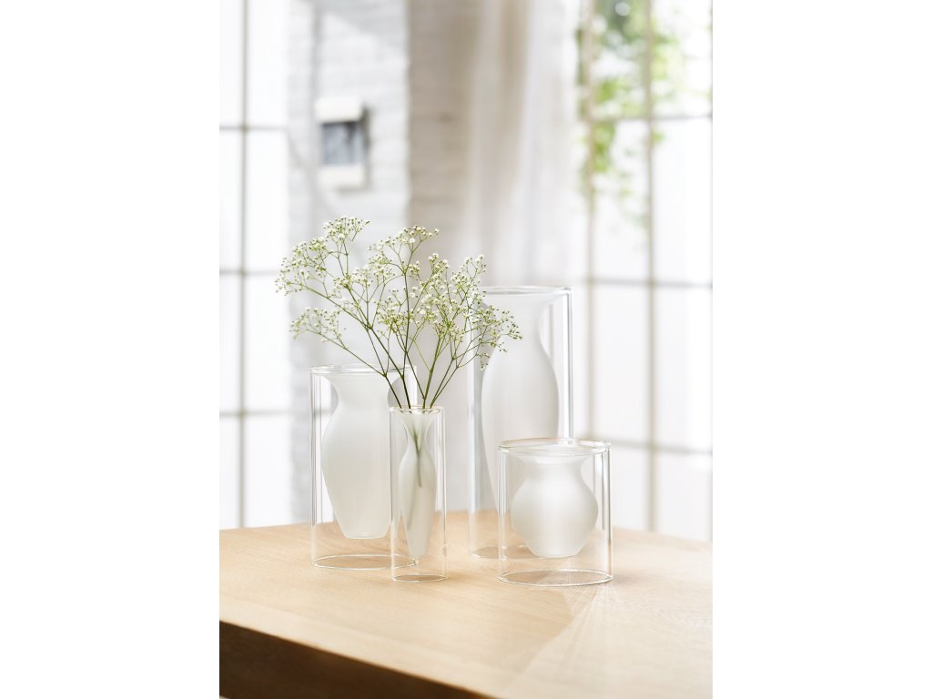 Má jedinečnou konstrukci. Je zasazená ve skleněné tubě a vypadá jakoby se vznášela. Tento úžasný efekt umocňuje kontrast mezi jasným a neprůhledným sklem. Je vyrobena ručně ze dvou částí. Vhodná do každého interiéru. Vynikající nápad na dárek, protože váza je opravdu jedinečná.