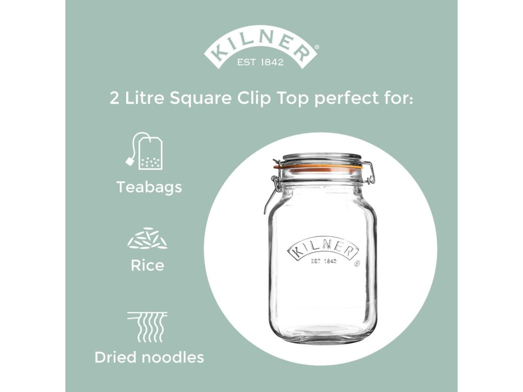 Skleněná zavařovací sklenice je ideální pro uchovávání potravin. Obsahuje vysoce kvalitní klipový systém z nerezové oceli, navržený tak, aby vytvářel dokonalé napětí a pokaždé poskytoval vzduchotěsné a bezpečné utěsnění. Kapacita nádoby je 2 l, pro uchování velkých dávek celého ovoce a zeleniny a skladování suchých potravin, jako jsou cereálie, čočka, těstoviny a sušenky. Perfektní je i nakládání kvašáků, utopenců a sýrů. Každá sklenice ztělesňuje tradiční styl Kilner s autentickým vyraženým logem.