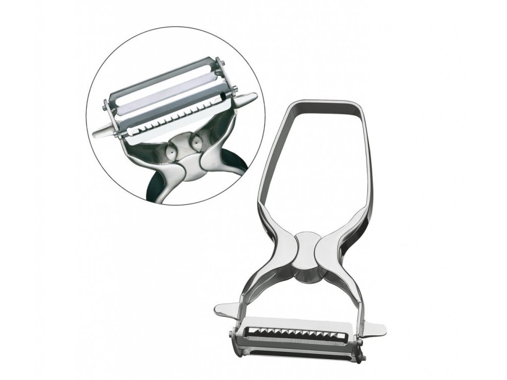 Nerezová škrabka 2v1 má dva nože vyrobené z nerezové oceli je vhodná pro praváky i leváky a využijete ji nejen k loupání brambor a zeleniny, abyste je zbavili slupek, které nepotřebujete, ale také pomocí ní uděláte jemné nudličky Juliene.