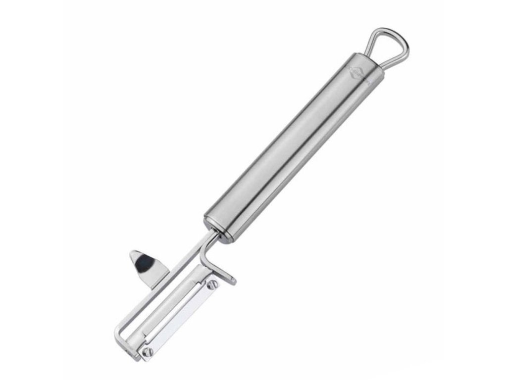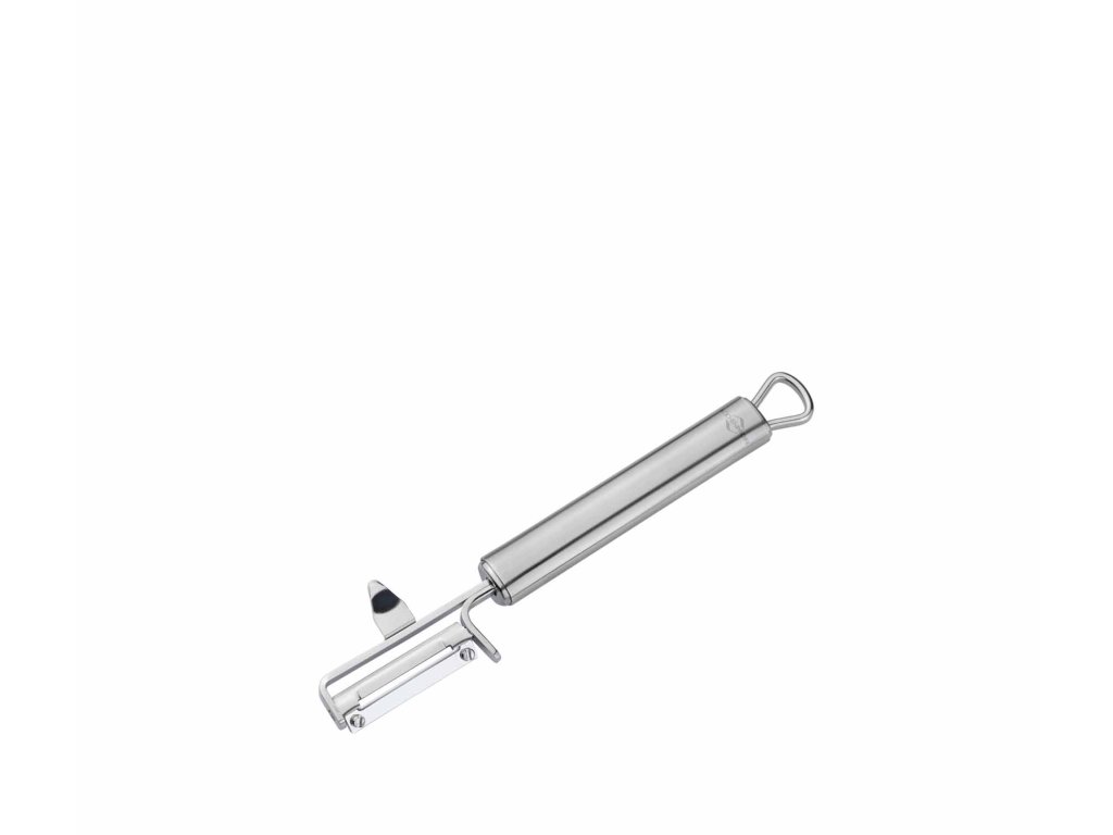 PARMA Škrabka na zeleninu z nerezové oceli s možností výměny čepele, která rychle a efektivně odstraňuje slupky z brambor, mrkví apod. Škrabku na podlouhlou zeleninu můžete díky očku na konci rukojeti pohodlně zavěsit.