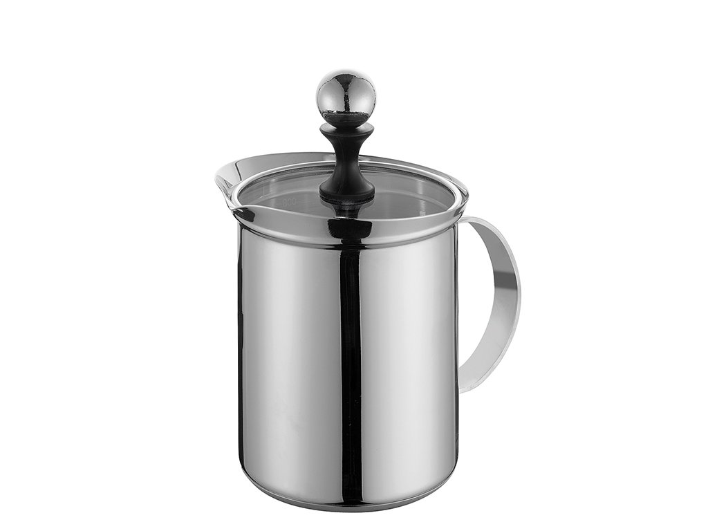 Šlehač na mléko DELUXE o objemu 800 ml z leštěné nerezové oceli s extra silným dnem o síle 4 mm, víčkem ze skla a s měrnou stupnicí. Vhodný na všechny typy varných desek včetně indukce.