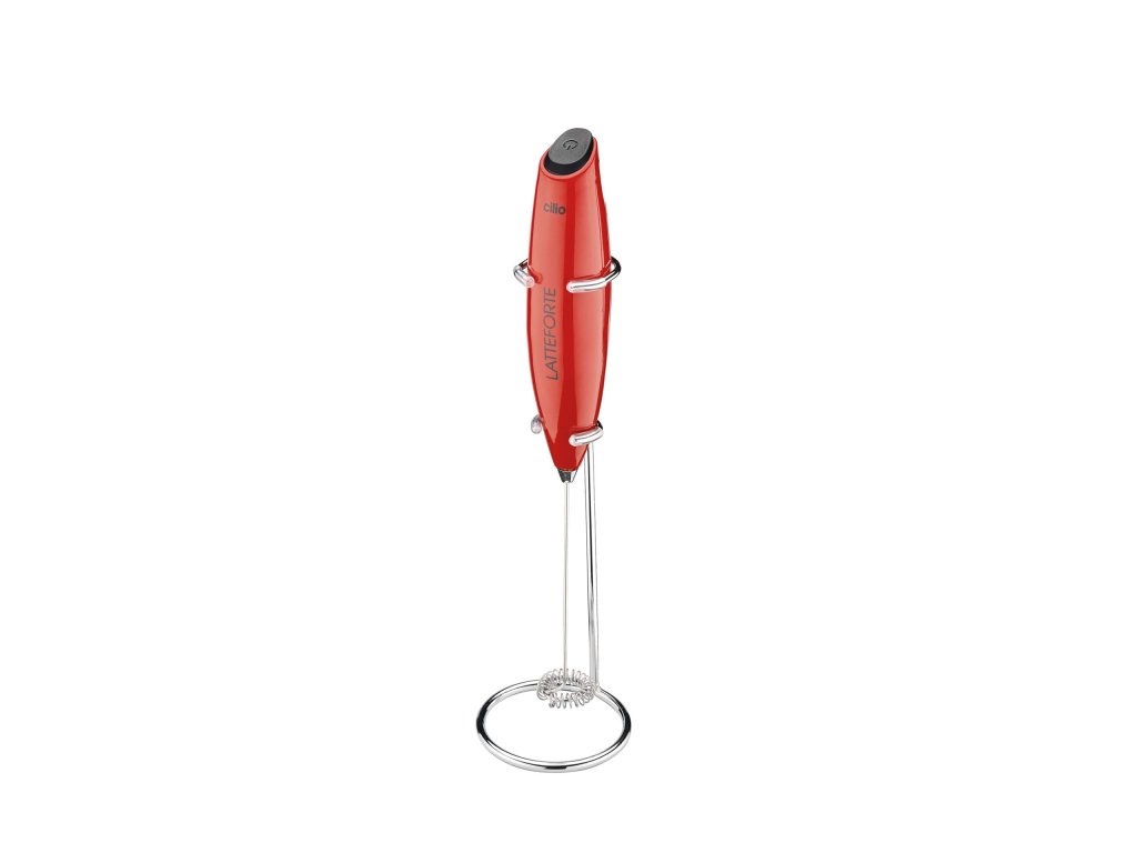 S červeným šlehačem mléka LATTEFORTE v matném provedení od německé firmy Cilio můžete rychle a snadno vytvořit pěnu pro své oblíbené nápoje, jako jsou capuccino, latté macchiato nebo horkou čokoládu. Šlehač pracuje s mlékem bez ohledu na jeho obsah tuku. S praktickým stojánkem pro odložení.